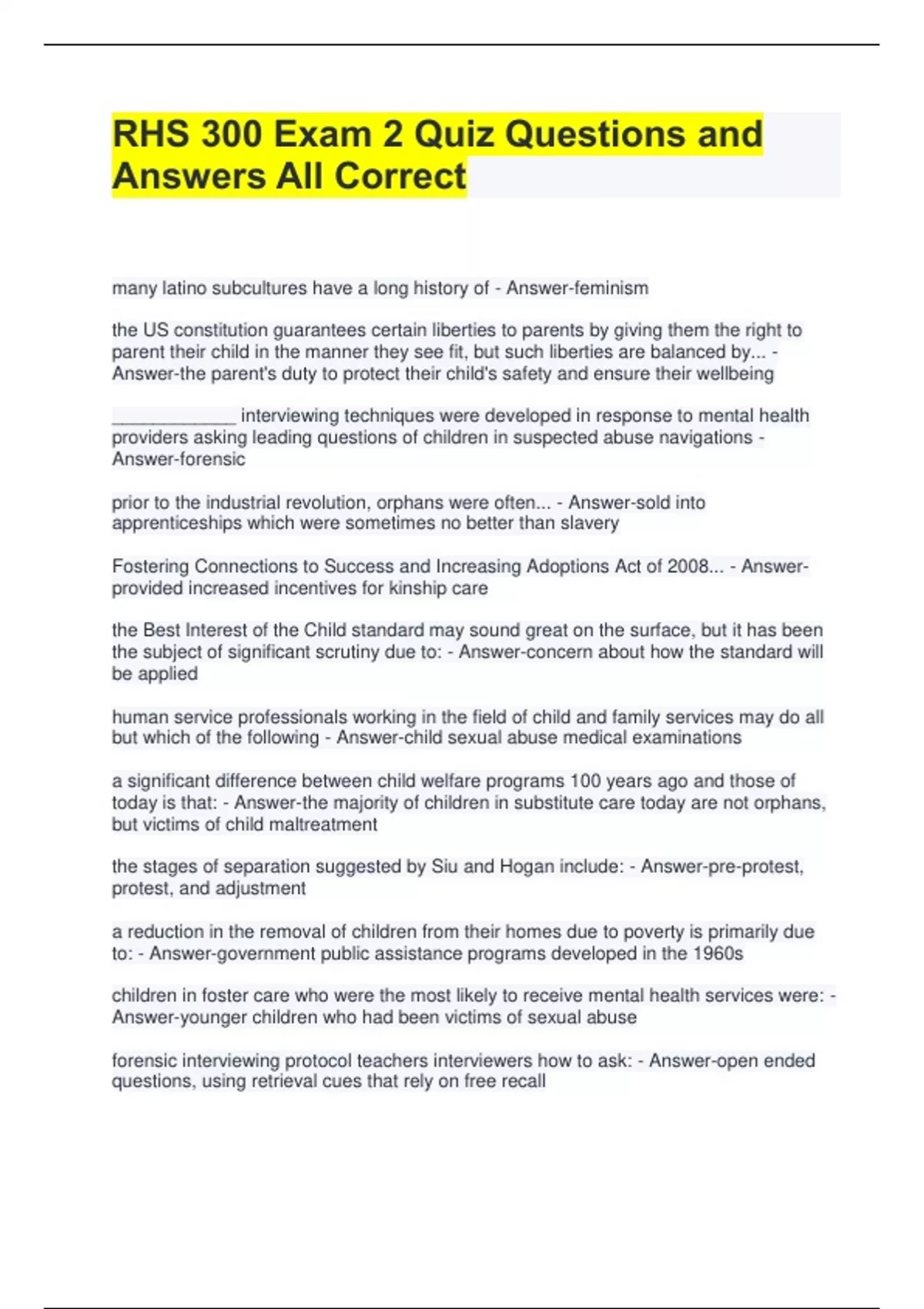 RHS 300 Exam 2 Quiz Questions and Answers All Correct many latino subcultures have a long history of - Answer-feminism the US constitution guarantees certain liberties to parents by giving them the right to parent their child in the manner they see fit, but such liberties are balanced by... - Answer-the parent's duty to protect their child's safety and ensure their wellbeing ____________ interviewing techniques were developed in response to mental health providers asking leading questions of children in suspected abuse navigations - Answer-forensic prior to the industrial revolution, orphans were often... - Answer-sold into apprenticeships which were sometimes no better than slavery Fostering Connections to Success and Increasing Adoptions Act of 2008... - Answerprovided increased incentives for kinship care the Best Interest of the Child standard may sound great on the surface, but it has been the subject of significant scrutiny due to: - Answer-concern about how the standard will be applied human service professionals working in the field of child and family services may do all but which of the following - Answer-child sexual abuse medical examinations a significant difference between child welfare programs 100 years ago and those of today is that: - Answer-the majority of children in substitute care today are not orphans, but victims of child maltreatment the stages of separation suggested by Siu and Hogan include: - Answer-pre-protest, protest, and adjustment a reduction in the removal of children from their homes due to poverty is primarily due to: - Answer-government public assistance programs developed in the 1960s children in foster care who were the most likely to receive mental health services were: - Answer-younger children who had been victims of sexual abuse forensic interviewing protocol teachers interviewers how to ask: - Answer-open ended questions, using retrieval cues that rely on free recall native latino families and immigrant latino families have many of the same risk factors for becoming involved in the chid welfare system, except that native latino families tend to experience _________ and ________ - Answer-drug abuse / a recent arrest according to research, one of the primary reasons why families of color are not referred for family preservation programs as often as caucasian families is: - Answer-racial bias on part of the case workers