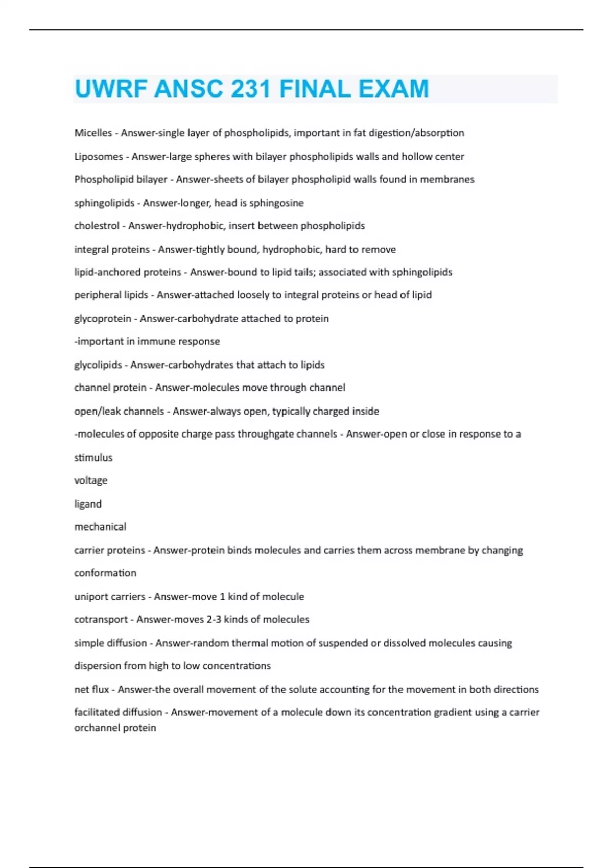 Micelles - Answer-single layer of phospholipids, important in fat digestion/absorption Liposomes - Answer-large spheres with bilayer phospholipids walls and hollow center Phospholipid bilayer - Answer-sheets of bilayer phospholipid walls found in membranes sphingolipids - Answer-longer, head is sphingosine cholestrol - Answer-hydrophobic, insert between phospholipids integral proteins - Answer-tightly bound, hydrophobic, hard to remove lipid-anchored proteins - Answer-bound to lipid tails; associated with sphingolipids peripheral lipids - Answer-attached loosely to integral proteins or head of lipid glycoprotein - Answer-carbohydrate attached to protein -important in immune response glycolipids - Answer-carbohydrates that attach to lipids channel protein - Answer-molecules move through channel open/leak channels - Answer-always open, typically charged inside -molecules of opposite charge pass throughgate channels - Answer-open or close in response to a stimulus voltage ligand mechanical carrier proteins - Answer-protein binds molecules and carries them across membrane by changing conformation uniport carriers - Answer-move 1 kind of molecule cotransport - Answer-moves 2-3 kinds of molecules simple diffusion - Answer-random thermal motion of suspended or dissolved molecules causing dispersion from high to low concentrations net flux - Answer-the overall movement of the solute accounting for the movement in both directions facilitated diffusion - Answer-movement of a molecule down its concentration gradient using a carrier orchannel proteinion channel - Answer-water-filled, voltage-gated tunnels that allow only ions of a certain size and or charge to pass aquaporin channel - Answer-hour-glass shaped channel lined with charged chemical groups that interact with polar water molecules