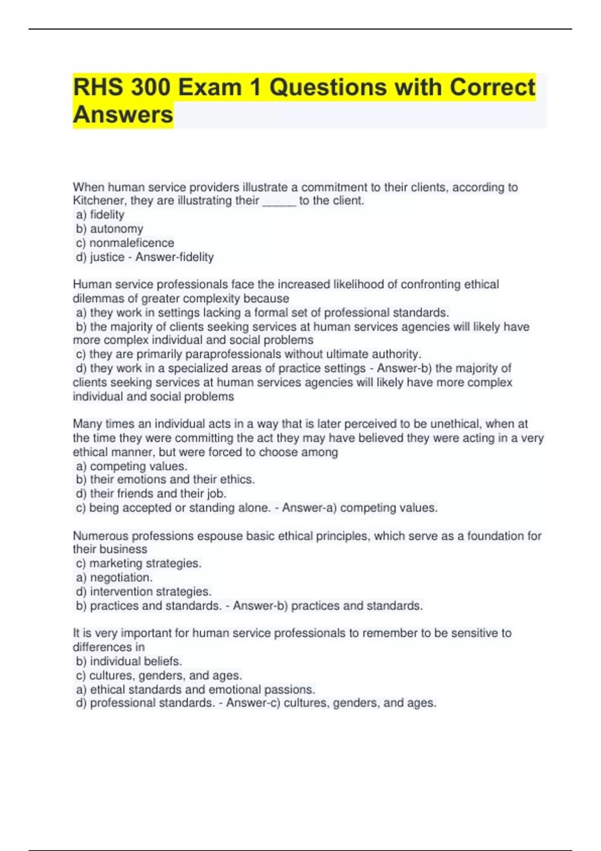 RHS 300 Exam 1 Questions with Correct Answer When human service providers illustrate a commitment to their clients, according to Kitchener, they are illustrating their _____ to the client. a) fidelity b) autonomy c) nonmaleficence d) justice - Answer-fidelity Human service professionals face the increased likelihood of confronting ethical dilemmas of greater complexity because a) they work in settings lacking a formal set of professional standards. b) the majority of clients seeking services at human services agencies will likely have more complex individual and social problems c) they are primarily paraprofessionals without ultimate authority. d) they work in a specialized areas of practice settings - Answer-b) the majority of clients seeking services at human services agencies will likely have more complex individual and social problems Many times an individual acts in a way that is later perceived to be unethical, when at the time they were committing the act they may have believed they were acting in a very ethical manner, but were forced to choose among a) competing values. b) their emotions and their ethics. d) their friends and their job. c) being accepted or standing alone. - Answer-a) competing values. Numerous professions espouse basic ethical principles, which serve as a foundation for their business c) marketing strategies. a) negotiation. d) intervention strategies. b) practices and standards. - Answer-b) practices and standards. It is very important for human service professionals to remember to be sensitive to differences in b) individual beliefs. c) cultures, genders, and ages. a) ethical standards and emotional passions. d) professional standards. - Answer-c) cultures, genders, and ages. Individuals who are motivated primarily by emotions are often b) creative. d) charismatic. a) passionate and adventurous. c) emotionally unstable. - Answer-c) emotionally unstable. The purpose of Kohlberg's Heinz Dilemma is to b) assess an adult's ability to take risks in various situations c) determine an individual's ethical reasoning ability d) analyze adult's coping styles a) evaluate children's intelligence quotient (IQ) - Answer-c) determine an individual's ethical reasoning ability The NOHS ethical standards includes c) a section for human services professionals and one for human service educators d) three sections, each containing information about different types of ethics a) a lengthy preamble designed to outline the legal ramifications for violating an ethical code. b) a section for human services professionals and one for paraprofessionals - Answerc) a section for human services professionals and one for human service educators The purpose of the NOHS ethical standards is to b) provide a comprehensive list of rules that all human service professionals must abide by, regardless of their state of residence. d) protect practitioners from unethical clients. a) provide human service professionals and educators with guidelines to help them manage ethical dilemmas effectively. c) provide a connection between all the helping fields, including human services, counseling and social work - Answer-a) provide human service professionals and educators with guidelines to help them manage ethical dilemmas effectively.