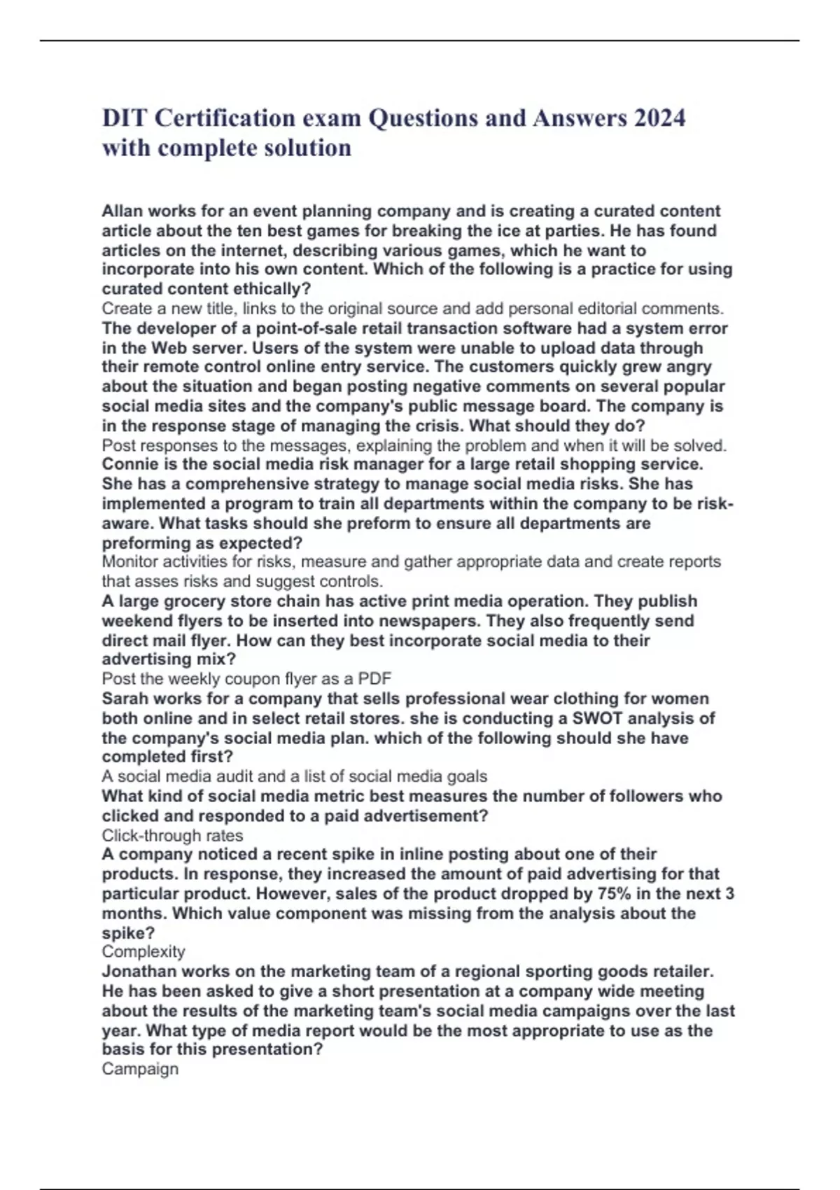 DIT Certification exam Questions and Answers 2024 with complete solution Allan works for an event planning company and is creating a curated content article about the ten best games for breaking the ice at parties. He has found articles on the internet, describing various games, which he want to incorporate into his own content. Which of the following is a practice for using curated content ethically? Create a new title, links to the original source and add personal editorial comments. The developer of a point-of-sale retail transaction software had a system error in the Web server. Users of the system were unable to upload data through their remote control online entry service. The customers quickly grew angry about the situation and began posting negative comments on several popular social media sites and the company's public message board. The company is in the response stage of managing the crisis. What should they do? Post responses to the messages, explaining the problem and when it will be solved. Connie is the social media risk manager for a large retail shopping service. She has a comprehensive strategy to manage social media risks. She has implemented a program to train all departments within the company to be risk-aware. What tasks should she preform to ensure all departments are preforming as expected? Monitor activities for risks, measure and gather appropriate data and create reports that asses risks and suggest controls. A large grocery store chain has active print media operation. They publish weekend flyers to be inserted into newspapers. They also frequently send direct mail flyer. How can they best incorporate social media to their advertising mix? Post the weekly coupon flyer as a PDF Sarah works for a company that sells professional wear clothing for women both online and in select retail stores. she is conducting a SWOT analysis of the company's social media plan. which of the following should she have completed first? A social media audit and a list of social media goals What kind of social media metric best measures the number of followers who clicked and responded to a paid advertisement? Click-through rates A company noticed a recent spike in inline posting about one of their products. In response, they increased the amount of paid advertising for that particular product. However, sales of the product dropped by 75% in the next 3 months. Which value component was missing from the analysis about the spike? Complexity Jonathan works on the marketing team of a regional sporting goods retailer. He has been asked to give a short presentation at a company wide meeting about the results of the marketing team's social media campaigns over the last year. What type of media report would be the most appropriate to use as the basis for this presentation? Campaign