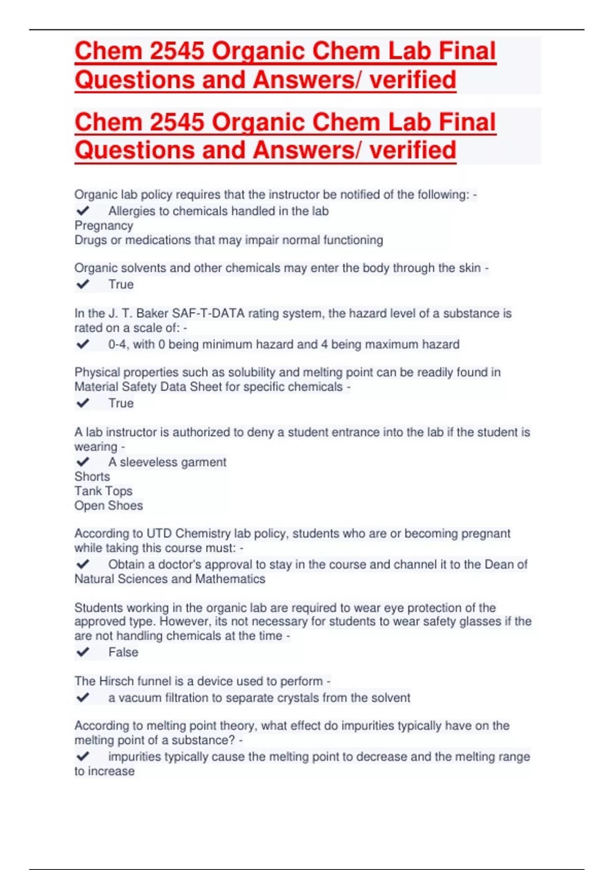 Chem 2545 Organic Chem Lab Final Questions and Answers verified