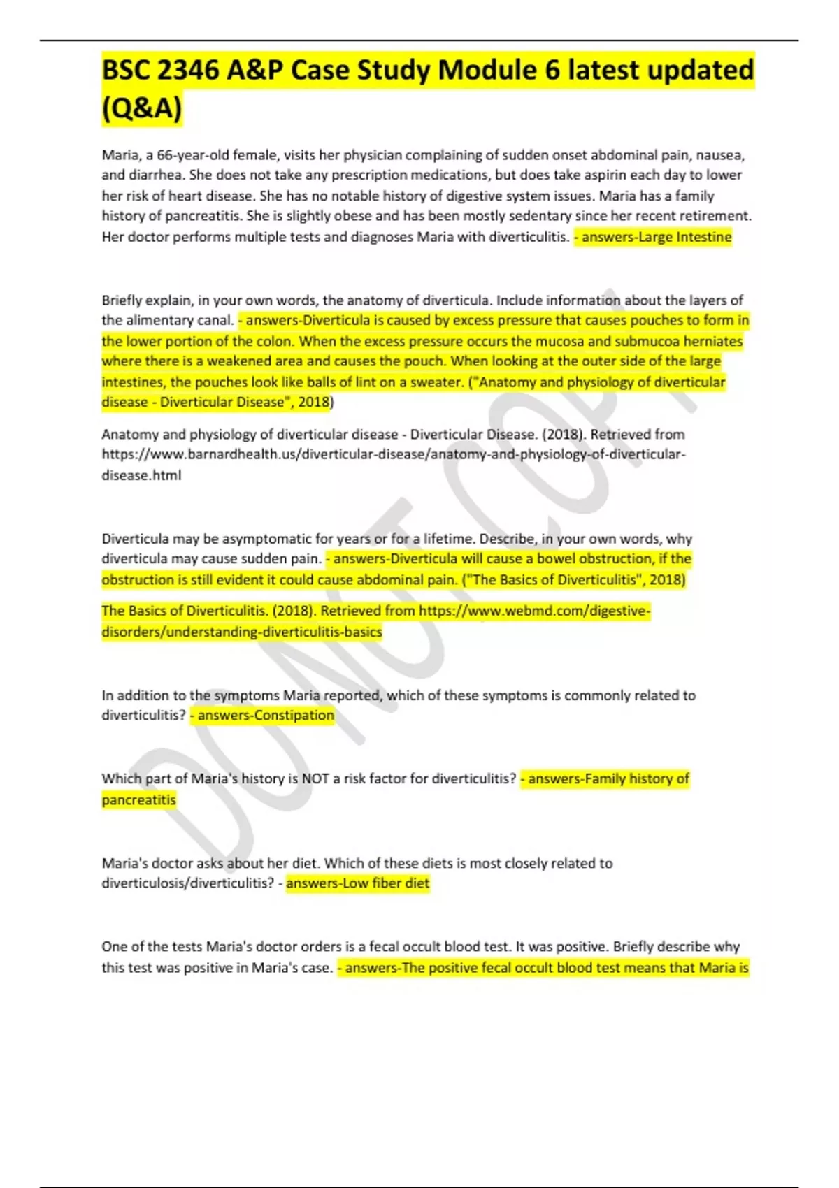 BSC 2346 A&P Case Study Module 6 latest updated (Q&A) Maria, a 66-year-old female, visits her physician complaining of sudden onset abdominal pain, nausea, and diarrhea. She does not take any prescription medications, but does take aspirin each day to lower her risk of heart disease. She has no notable history of digestive system issues. Maria has a family history of pancreatitis. She is slightly obese and has been mostly sedentary since her recent retirement. Her doctor performs multiple tests and diagnoses Maria with diverticulitis. - answers-Large Intestine