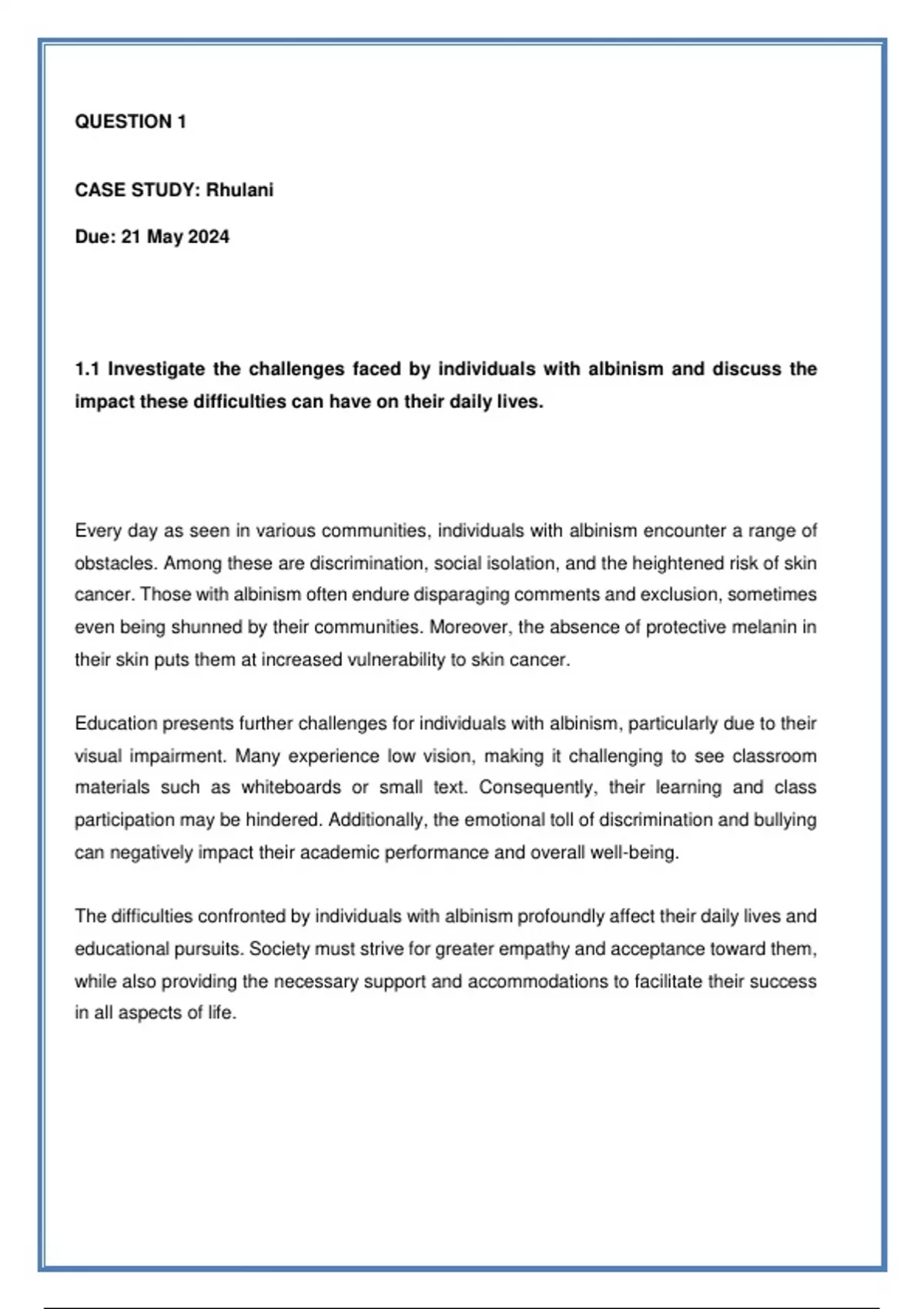 1.1 Investigate the challenges faced by individuals with albinism and discuss the