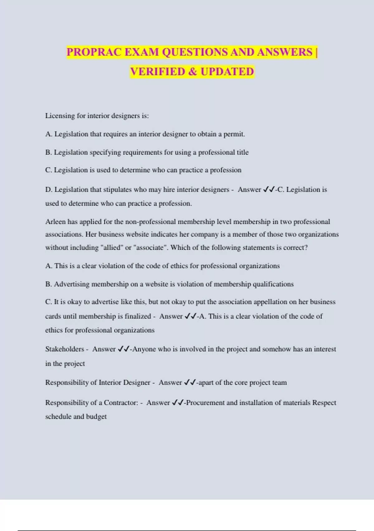 PROPRAC EXAM QUESTIONS AND ANSWERS | VERIFIED & UPDATED Licensing for interior designers is: A. Legislation that requires an interior designer to obtain a permit. B. Legislation specifying requirements for using a professional title C. Legislation is used to determine who can practice a profession D. Legislation that stipulates who may hire interior designers - Answer ️️ -C. Legislation is used to determine who can practice a profession. Arleen has applied for the non-professional membership level membership in two professional associations. Her business website indicates her company is a member of those two organizations without including "allied" or "associate". Which of the following statements is correct? A. This is a clear violation of the code of ethics for professional organizations B. Advertising membership on a website is violation of membership qualifications C. It is okay to advertise like this, but not okay to put the association appellation on her business cards until membership is finalized - Answer ️️ -A. This is a clear violation of the code of ethics for professional organizations Stakeholders - Answer ️️ -Anyone who is involved in the project and somehow has an interest in the project Responsibility of Interior Designer - Answer ️️ -apart of the core project team Responsibility of a Contractor: - Answer ️️ -Procurement and installation of materials Respect schedule and budget Responsibility of Vendor/Dealer - Answer ️️ -Sell material to trade/subcontractor; In most cases dealers provide full services- demo, installation to maintenance. What are the phases of an Interior Design project: - Answer ️️ -Programming/predesign, Schematic Design, Design development, Contract Documents, and Contract Administration What is Programming/Predesign - Answer ️️ -initial phase, information-gathering: client expectations, functional needs, aesthetics, and factors concerning the interior itself. What is Schematic Design? - Answer ️️ -The execution of preliminary design decisions; written concept statement, bubble diagram, block plans, preliminary floor plans, sketches, FFE, preliminary estimate What is Design Development? - Answer ️️ -Further development of SD. The phase in which final decisions for plans, specifications, and any final presentation graphics are made. Contract Documents Phase - Answer ️️ -Prepare construction drawings or working drawings and specifications Construction Drawings OR Working Drawings - Answer ️️ -instructions on how to complete the project Specification - Answer ️️ -part of contract documents that
