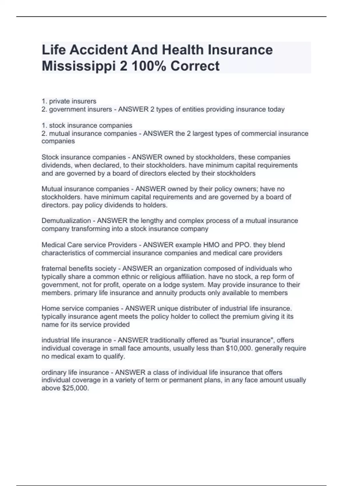 Life Accident And Health Insurance Mississippi 2 100% Correct Life Accident And Health Insurance Mississippi 2 100% Correct Life Accident And Health Insurance Mississippi 2 100% Correct Life Accident And Health Insurance Mississippi 2 100% Correct Life Accident And Health Insurance Mississippi 2 100% Correct 1. private insurers 2. government insurers - ANSWER 2 types of entities providing insurance today 1. stock insurance companies 2. mutual insurance companies - ANSWER the 2 largest types of commercial insurance companies Stock insurance companies - ANSWER owned by stockholders, these companies dividends, when declared, to their stockholders. have minimum capital requirements and are governed by a board of directors elected by their stockholders Mutual insurance companies - ANSWER owned by their policy owners; have no stockholders. have minimum capital requirements and are governed by a board of