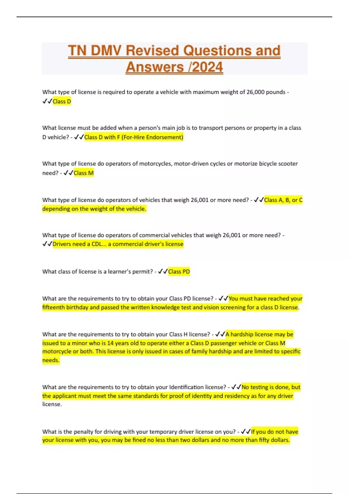 tn dmv revised questions and answers 2024