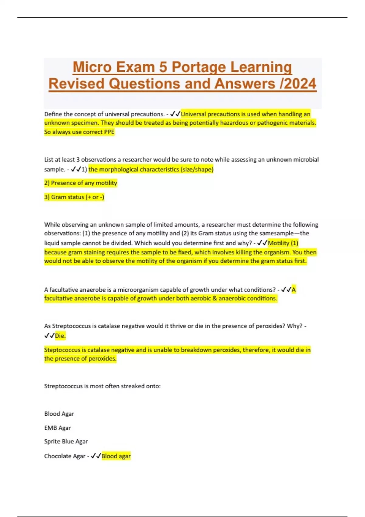 Define the concept of universal precautions. - Universal precautions is used when handling an unknown specimen. They should be treated as being potentially hazardous or pathogenic materials. So always use correct PPE List at least 3 observations a researcher would be sure to note while assessing an unknown microbial sample. - 1) the morphological characteristics (size/shape) 2) Presence of any motility 3) Gram status (+ or -) While observing an unknown sample of limited amounts, a researcher must determine the following observations: (1) the presence of any motility and (2) its Gram status using the samesample—the liquid sample cannot be divided. Which would you determine first and why? - Motility (1) because gram staining requires the sample to be fixed, which involves killing the organism. You then would not be able to observe the motility of the organism if you determine the gram status first. A facultative anaerobe is a microorganism capable of growth under what conditions? - A facultative anaerobe is capable of growth under both aerobic & anaerobic conditions. As Streptococcus is catalase negative would it thrive or die in the presence of peroxides? Why? - Die. Steptococcus is catalase negative and is unable to breakdown peroxides, therefore, it would die in the presence of peroxides. Streptococcus is most often streaked onto: Blood Agar EMB Agar Sprite Blue Agar Chocolate Agar - Blood agar The distinction for Lancefield subgroups lie in its (Select All that Apply) A)Catlyse Activity B)Carbohydrate composition of antigen C)Hemotlyic Acitivty D)All of the Above - B) Carbohydrate composition of antigen True or False. The Lancefield groups are used to subdivide antigenic groups of alpha-hemolytic Streptococcus. - False: The Lancefield groupings are used to subdivide beta-hemolytic strep Greater than 90% of all human streptococcal infections belong to: Group A Group B Group C Group D - Group A Rheumatic fever displays_____hemolytic activity and occurs when____is left untreated - Beta, Strep, Pharyngitis Left untreated, strep throat can progress to ______ , which displays _____ hemolytic activity. Strep, Septicemia, gamma Rheumatic fever; beta Strep, Pharyngitis; beta Strep Pharyngitis, alpha - Rheumatic fever; beta
