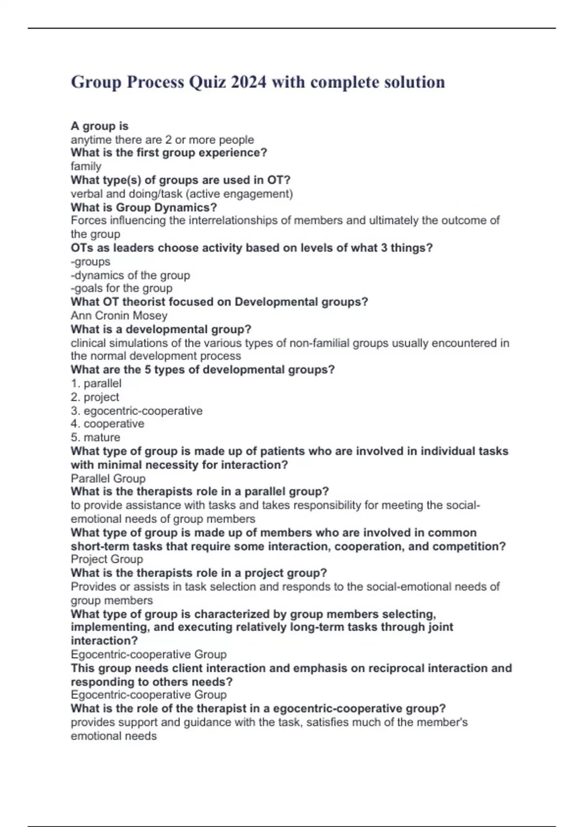 Group Process Quiz 2024 with complete solution A group is anytime there are 2 or more people What is the first group experience? family What type(s) of groups are used in OT? verbal and doing/task (active engagement) What is Group Dynamics? Forces influencing the interrelationships of members and ultimately the outcome of the group OTs as leaders choose activity based on levels of what 3 things? -groups -dynamics of the group -goals for the group What OT theorist focused on Developmental groups? Ann Cronin Mosey What is a developmental group? clinical simulations of the various types of non-familial groups usually encountered in the normal development process What are the 5 types of developmental groups? 1. parallel 2. project 3. egocentric-cooperative 4. cooperative 5. mature What type of group is made up of patients who are involved in individual tasks with minimal necessity for interaction? Parallel Group What is the therapists role in a parallel group? to provide assistance with tasks and takes responsibility for meeting the social-emotional needs of group members What type of group is made up of members who are involved in common short-term tasks that require some interaction, cooperation, and competition? Project Group What is the therapists role in a project group? Provides or assists in task selection and responds to the social-emotional needs of group members What type of group is characterized by group members selecting, implementing, and executing relatively long-term tasks through joint interaction? Egocentric-cooperative Group This group needs client interaction and emphasis on reciprocal interaction and responding to others needs? Egocentric-cooperative Group What is the role of the therapist in a egocentric-cooperative group? provides support and guidance with the task, satisfies much of the member's emotional needs