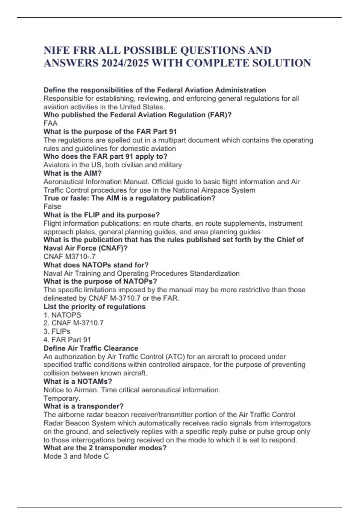 NIFE FRR ALL POSSIBLE QUESTIONS AND ANSWERS 2024/2025 WITH COMPLETE SOLUTION Define the responsibilities of the Federal Aviation Administration Responsible for establishing, reviewing, and enforcing general regulations for all aviation activities in the United States. Who published the Federal Aviation Regulation (FAR)? FAA What is the purpose of the FAR Part 91 The regulations are spelled out in a multipart document which contains the operating rules and guidelines for domestic aviation Who does the FAR part 91 apply to? Aviators in the US, both civilian and military What is the AIM? Aeronautical Information Manual. Official guide to basic flight information and Air Traffic Control procedures for use in the National Airspace System True or fasle: The AIM is a regulatory publication? False What is the FLIP and its purpose? Flight information publications: en route charts, en route supplements, instrument approach plates, general planning guides, and area planning guides What is the publication that has the rules published set forth by the Chief of Naval Air Force (CNAF)? CNAF M3710-.7 What does NATOPs stand for? Naval Air Training and Operating Procedures Standardization What is the purpose of NATOPs? The specific limitations imposed by the manual may be more restrictive than those delineated by CNAF M-3710.7 or the FAR. List the priority of regulations 1. NATOPS 2. CNAF M-3710.7 3. FLIPs 4. FAR Part 91 Define Air Traffic Clearance An authorization by Air Traffic Control (ATC) for an aircraft to proceed under specified traffic conditions within controlled airspace, for the purpose of preventing collision between known aircraft. What is a NOTAMs? Notice to Airman. Time critical aeronautical information. Temporary. What is a transponder? The airborne radar beacon receiver/transmitter portion of the Air Traffic Control Radar Beacon System which automatically receives radio signals from interrogators on the ground, and selectively replies with a specific reply pulse or pulse group only to those interrogations being received on the mode to which it is set to respond. What are the 2 transponder modes? Mode 3 and Mode C
