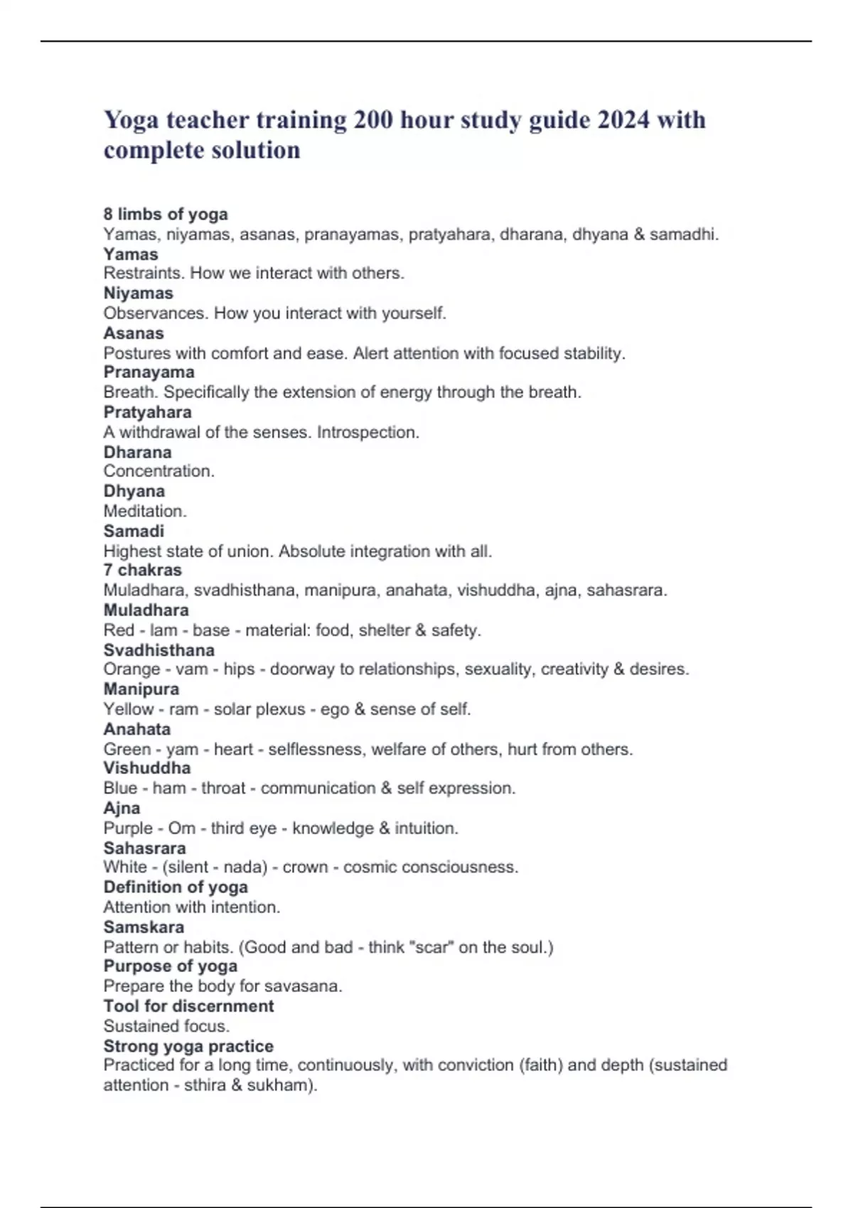Yoga teacher training 200 hour study guide 2024 with complete solution 8 limbs of yoga Yamas, niyamas, asanas, pranayamas, pratyahara, dharana, dhyana & samadhi. Yamas Restraints. How we interact with others. Niyamas Observances. How you interact with yourself. Asanas Postures with comfort and ease. Alert attention with focused stability. Pranayama Breath. Specifically the extension of energy through the breath. Pratyahara A withdrawal of the senses. Introspection. Dharana Concentration. Dhyana Meditation. Samadi Highest state of union. Absolute integration with all. 7 chakras Muladhara, svadhisthana, manipura, anahata, vishuddha, ajna, sahasrara. Muladhara Red - lam - base - material: food, shelter & safety. Svadhisthana Orange - vam - hips - doorway to relationships, sexuality, creativity & desires. Manipura Yellow - ram - solar plexus - ego & sense of self. Anahata Green - yam - heart - selflessness, welfare of others, hurt from others. Vishuddha Blue - ham - throat - communication & self expression. Ajna Purple - Om - third eye - knowledge & intuition. Sahasrara White - (silent - nada) - crown - cosmic consciousness. Definition of yoga Attention with intention. Samskara Pattern or habits. (Good and bad - think "scar" on the soul.) Purpose of yoga Prepare the body for savasana. Tool for discernment Sustained focus. Strong yoga practice Practiced for a long time, continuously, with conviction (faith) and depth (sustained attention - sthira & sukham).