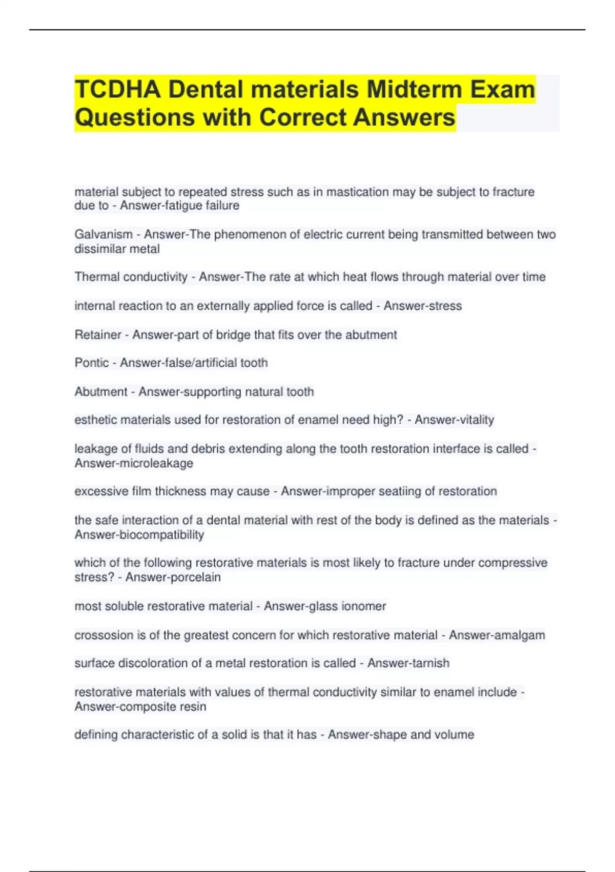 TCDHA Dental materials Midterm Exam Questions with Correct Answers material subject to repeated stress such as in mastication may be subject to fracture due to - Answer-fatigue failure Galvanism - Answer-The phenomenon of electric current being transmitted between two dissimilar metal Thermal conductivity - Answer-The rate at which heat flows through material over time internal reaction to an externally applied force is called - Answer-stress Retainer - Answer-part of bridge that fits over the abutment Pontic - Answer-false/artificial tooth Abutment - Answer-supporting natural tooth esthetic materials used for restoration of enamel need high? - Answer-vitality leakage of fluids and debris extending along the tooth restoration interface is called - Answer-microleakage excessive film thickness may cause - Answer-improper seatiing of restoration the safe interaction of a dental material with rest of the body is defined as the materials - Answer-biocompatibility which of the following restorative materials is most likely to fracture under compressive stress? - Answer-porcelain most soluble restorative material - Answer-glass ionomer crossosion is of the greatest concern for which restorative material - Answer-amalgam surface discoloration of a metal restoration is called - Answer-tarnish restorative materials with values of thermal conductivity similar to enamel include - Answer-composite resin defining characteristic of a solid is that it has - Answer-shape and volume most stable primary bonds - Answer-have regular crystalline structures correct term for describing the macimal amount of stress a material can withstand without breaking is - Answer-ultimate strength when the weight of a material increases in relationship to its volume, this is described as - Answer-dense
