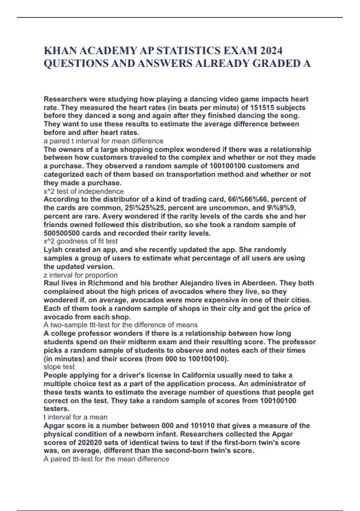 KHAN ACADEMY AP STATISTICS EXAM 2024 QUESTIONS AND ANSWERS ALREADY GRADED A Researchers were studying how playing a dancing video game impacts heart rate. They measured the heart rates (in beats per minute) of 151515 subjects before they danced a song and again after they finished dancing the song. They want to use these results to estimate the average difference between before and after heart rates. a paired t interval for mean difference The owners of a large shopping complex wondered if there was a relationship between how customers traveled to the complex and whether or not they made a purchase. They observed a random sample of customers and categorized each of them based on transportation method and whether or not they made a purchase. x^2 test of independence According to the distributor of a kind of trading card, 66%66%66, percent of the cards are common, 25%25%25, percent are uncommon, and 9%9%9, percent are rare. Avery wondered if the rarity levels of the cards she and her friends owned followed this distribution, so she took a random sample of cards and recorded their rarity levels. x^2 goodness of fit test Lylah created an app, and she recently updated the app. She randomly samples a group of users to estimate what percentage of all users are using the updated version. z interval for proportion Raul lives in Richmond and his brother Alejandro lives in Aberdeen. They both complained about the high prices of avocados where they live, so they wondered if, on average, avocados were more expensive in one of their cities. Each of them took a random sample of shops in their city and got the price of avocado from each shop. A two-sample ttt-test for the difference of means A college professor wonders if there is a relationship between how long students spend on their midterm exam and their resulting score. The professor picks a random sample of students to observe and notes each of their times (in minutes) and their scores (from 000 to ). slope test People applying for a driver's license In California usually need to take a multiple choice test as a part of the application process. An administrator of these tests wants to estimate the average number of questions that people get correct on the test. They take a random sample of scores from testers. t interval for a mean Apgar score is a number between 000 and 101010 that gives a measure of the physical condition of a newborn infant. Researchers collected the Apgar scores of 202020 sets of identical twins to test if the first-born twin's score was, on average, different than the second-born twin's score. A paired ttt-test for the mean difference