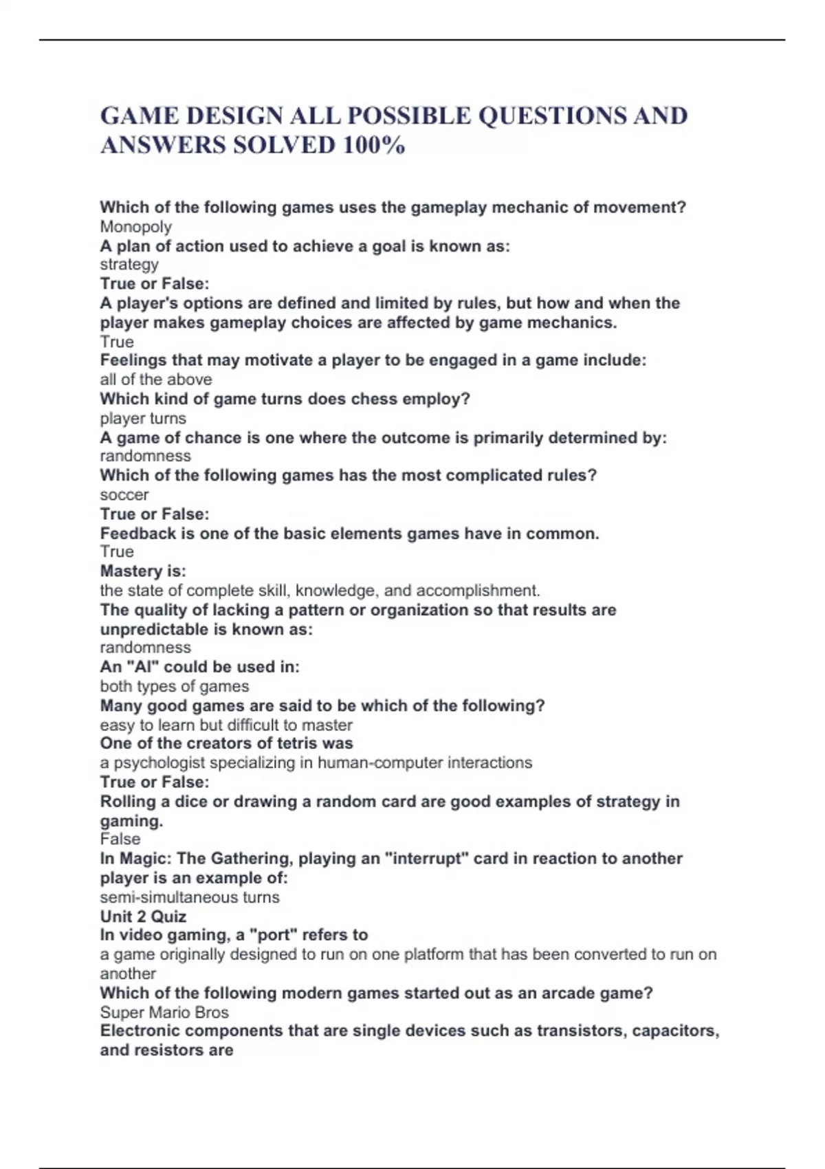 GAME DESIGN ALL POSSIBLE QUESTIONS AND ANSWERS SOLVED 100% Which of the following games uses the gameplay mechanic of movement? Monopoly A plan of action used to achieve a goal is known as: strategy True or False: A player's options are defined and limited by rules, but how and when the player makes gameplay choices are affected by game mechanics. True Feelings that may motivate a player to be engaged in a game include: all of the above Which kind of game turns does chess employ? player turns A game of chance is one where the outcome is primarily determined by: randomness Which of the following games has the most complicated rules? soccer True or False: Feedback is one of the basic elements games have in common. True Mastery is: the state of complete skill, knowledge, and accomplishment. The quality of lacking a pattern or organization so that results are unpredictable is known as: randomness An "AI" could be used in: both types of games Many good games are said to be which of the following? easy to learn but difficult to master One of the creators of tetris was a psychologist specializing in human-computer interactions True or False: Rolling a dice or drawing a random card are good examples of strategy in gaming. False In Magic: The Gathering, playing an "interrupt" card in reaction to another player is an example of: semi-simultaneous turns Unit 2 Quiz In video gaming, a "port" refers to a game originally designed to run on one platform that has been converted to run on another Which of the following modern games started out as an arcade game? Super Mario Bros Electronic components that are single devices such as transistors, capacitors, and resistors are