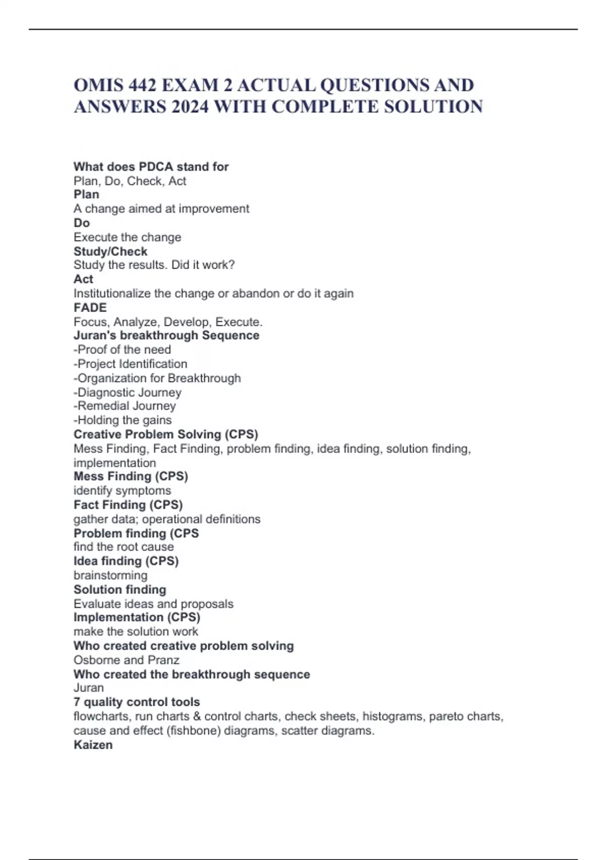 OMIS 442 EXAM 2 ACTUAL QUESTIONS AND ANSWERS 2024 WITH COMPLETE SOLUTION What does PDCA stand for Plan, Do, Check, Act Plan A change aimed at improvement Do Execute the change Study/Check Study the results. Did it work? Act Institutionalize the change or abandon or do it again FADE Focus, Analyze, Develop, Execute. Juran's breakthrough Sequence -Proof of the need -Project Identification -Organization for Breakthrough -Diagnostic Journey -Remedial Journey -Holding the gains Creative Problem Solving (CPS) Mess Finding, Fact Finding, problem finding, idea finding, solution finding, implementation Mess Finding (CPS) identify symptoms Fact Finding (CPS) gather data; operational definitions Problem finding (CPS find the root cause Idea finding (CPS) brainstorming Solution finding Evaluate ideas and proposals Implementation (CPS) make the solution work Who created creative problem solving Osborne and Pranz Who created the breakthrough sequence Juran 7 quality control tools flowcharts, run charts & control charts, check sheets, histograms, pareto charts, cause and effect (fishbone) diagrams, scatter diagrams. Kaizen