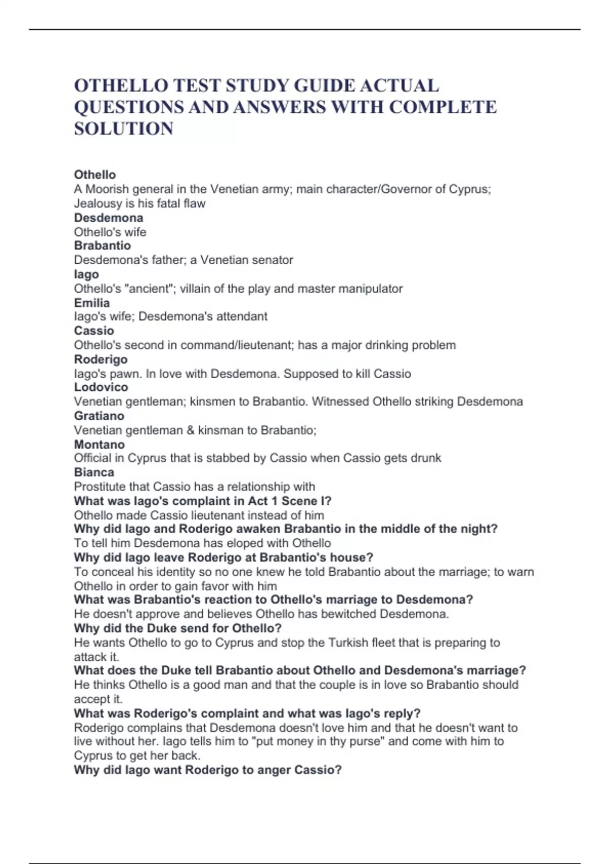 OTHELLO TEST STUDY GUIDE ACTUAL QUESTIONS AND ANSWERS WITH COMPLETE SOLUTION Othello A Moorish general in the Venetian army; main character/Governor of Cyprus; Jealousy is his fatal flaw Desdemona Othello's wife Brabantio Desdemona's father; a Venetian senator Iago Othello's "ancient"; villain of the play and master manipulator Emilia Iago's wife; Desdemona's attendant Cassio Othello's second in command/lieutenant; has a major drinking problem Roderigo Iago's pawn. In love with Desdemona. Supposed to kill Cassio Lodovico Venetian gentleman; kinsmen to Brabantio. Witnessed Othello striking Desdemona Gratiano Venetian gentleman & kinsman to Brabantio; Montano Official in Cyprus that is stabbed by Cassio when Cassio gets drunk Bianca Prostitute that Cassio has a relationship with What was Iago's complaint in Act 1 Scene I? Othello made Cassio lieutenant instead of him Why did Iago and Roderigo awaken Brabantio in the middle of the night? To tell him Desdemona has eloped with Othello Why did Iago leave Roderigo at Brabantio's house? To conceal his identity so no one knew he told Brabantio about the marriage; to warn Othello in order to gain favor with him What was Brabantio's reaction to Othello's marriage to Desdemona? He doesn't approve and believes Othello has bewitched Desdemona. Why did the Duke send for Othello? He wants Othello to go to Cyprus and stop the Turkish fleet that is preparing to attack it. What does the Duke tell Brabantio about Othello and Desdemona's marriage? He thinks Othello is a good man and that the couple is in love so Brabantio should accept it. What was Roderigo's complaint and what was Iago's reply? Roderigo complains that Desdemona doesn't love him and that he doesn't want to live without her. Iago tells him to "put money in thy purse" and come with him to Cyprus to get her back. Why did Iago want Roderigo to anger Cassio?