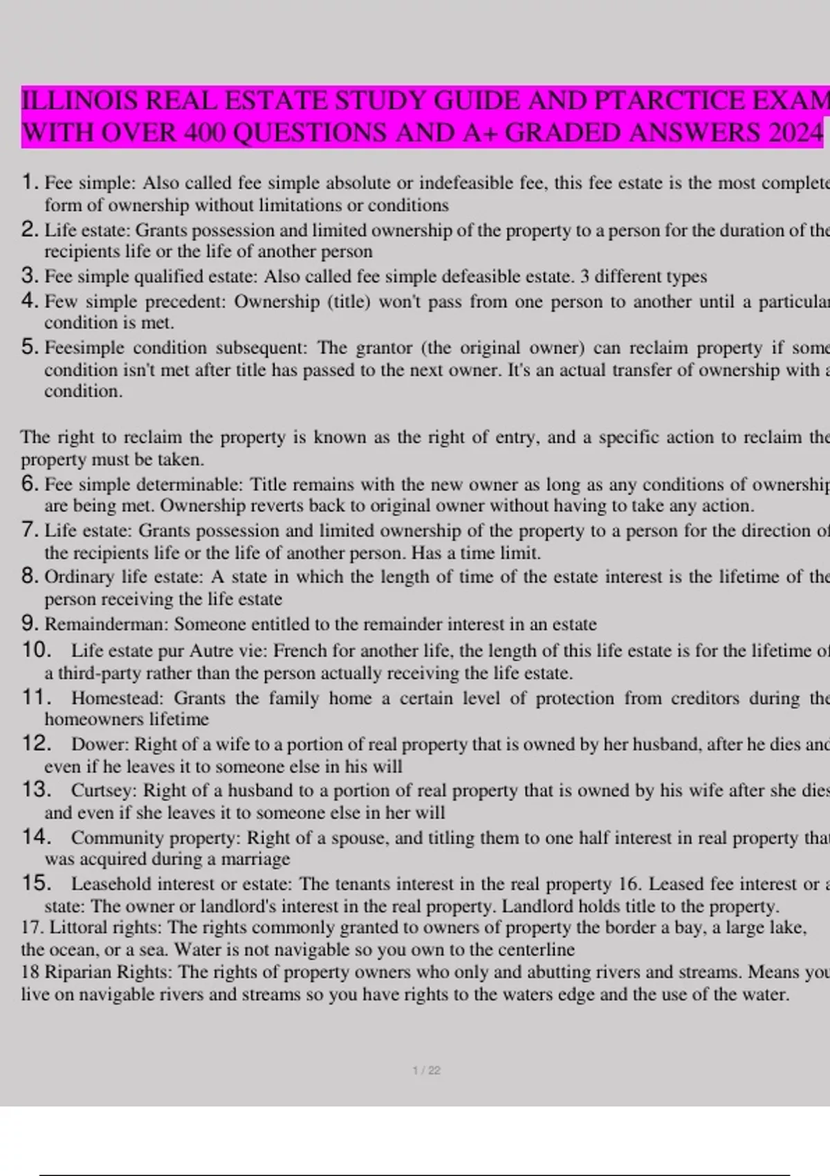 ILLINOIS REAL ESTATE STUDY GUIDE AND PRACTICE EXAM WITH OVER 400 QUESTIONS AND A+ GRADED ANSWERS 2024