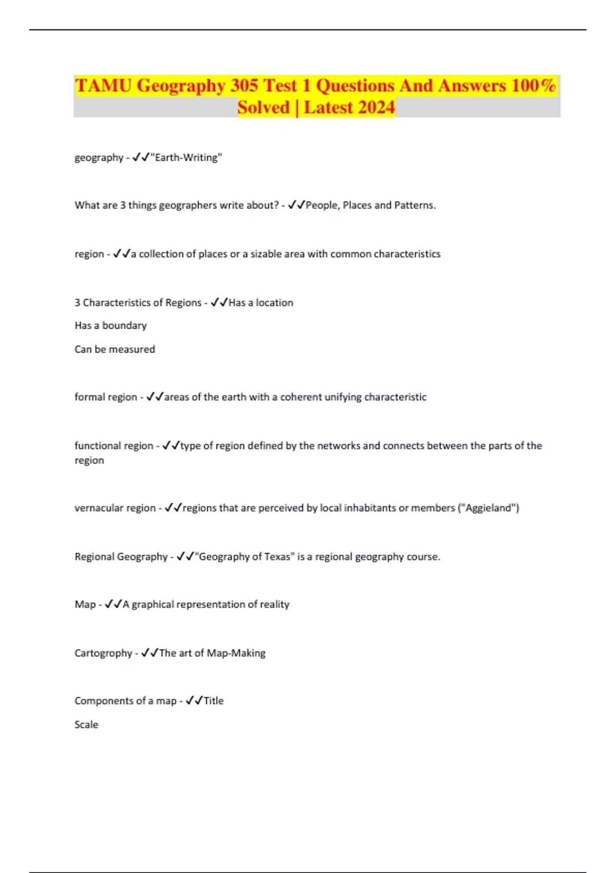 TAMU Geography 305 Test 1 Questions And Answers 100% Solved | Latest 2024 geography - "Earth-Writing" What are 3 things geographers write about? - People, Places and Patterns. region - a collection of places or a sizable area with common characteristics 3 Characteristics of Regions - Has a location Has a boundary Can be measured formal region - areas of the earth with a coherent unifying characteristic functional region - type of region defined by the networks and connects between the parts of the region vernacular region - regions that are perceived by local inhabitants or members ("Aggieland") Regional Geography - "Geography of Texas" is a regional geography course. Map - A graphical representation of reality Cartogrophy - The art of Map-Making Components of a map - Title Scale Legend Date Grid Direction Diffusion - Geographical spread of ideas, innovations, and attitudes through human contact and communication. Migration - The relatively permanent movement from one place to another. Place Utility Theory - Says that people will make rational choices to migrate. internal relations - the interactions between the various components of the region external relations - the interactions between counterpart regions absolute location - exact and precise location relative location - location that is not exact and is typically perspectivist site - the local scale of a pace, including the immediate terrain, natural resources, and human settlement How did humans first come to the Americas? - Migrated from Siberia across the land bridge to North America. What is Clovis? - An archaeological site that puts humans arriving in Texas approximately 13,000 years ago. Map Scale - the relative dimension ratio of reduction or enlargement in picture, map, etc. situation - the relative location of a place columbian exchange - the two-way exchange of people, plants/animals, and cultures between the New World and Old World since 1492 Columbus Discovers America - Discovers the Americas in 1492. Might be the greatest cultural and ecological event in world history. What diseases were exchanged between the New and Old World? Who was most effected by them? - Measles, Smallpox, Tuberculosis, Flu, Pertussis and Malaria. The Native Americans were most impacted by disease. Components of Columbian Exchange in Texas: - Diffusion of culture, European migration, Native Americans, links to the Old World like Africa and Asia. European Diffusion of Culture in Texas - Imperial powers were competing against each other. Explored and charted new lands and claimed them for the crown. Europeans bring ideas like organization and how to use space, and structures like economic and political organizations. European Migration - Most came from the Iberian peninsula, like the Spanish Conquistadors. However there was central European migration as well, like French. What regions did Europeans immigrate to? - Mexico and Peru (existing civilization locations) The Tropics (Early Plantation Economics) Northern Mid-Latitudes (U.S. and Canada) Southern Mid-Latitudes (Brazil, Argentina and Chile) language - the shared system of meanings associate with sounds and symbols