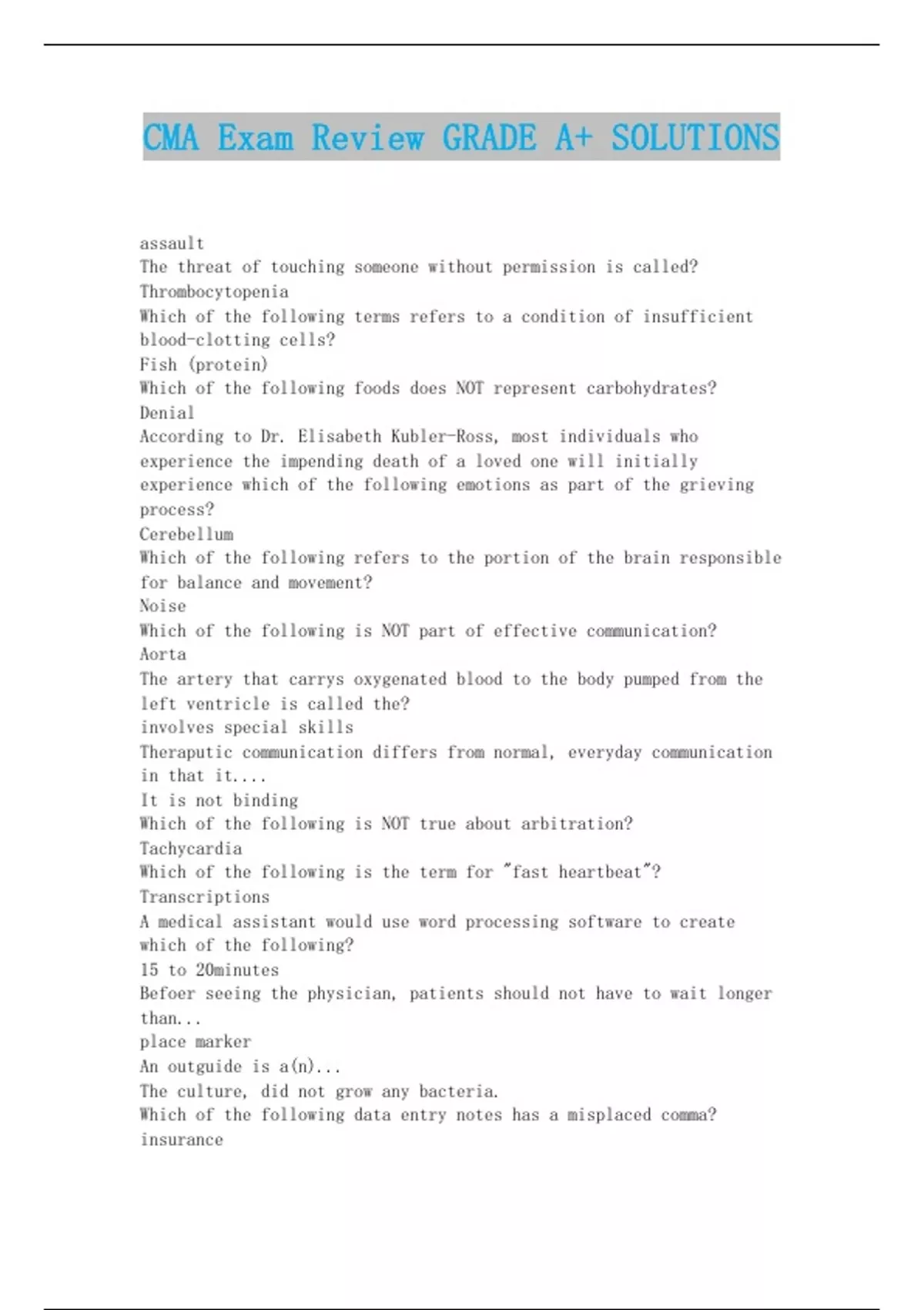 assault The threat of touching someone without permission is called? Thrombocytopenia Which of the following terms refers to a condition of insufficient blood-clotting cells? Fish (protein) Which of the following foods does NOT represent carbohydrates? Denial According to Dr. Elisabeth Kubler-Ross, most individuals who experience the impending death of a loved one will initially experience which of the following emotions as part of the grieving process? Cerebellum Which of the following refers to the portion of the brain responsible for balance and movement? Noise Which of the following is NOT part of effective communication? Aorta The artery that carrys oxygenated blood to the body pumped from the left ventricle is called the? involves special skills Theraputic communication differs from normal, everyday communication in that it.... It is not binding Which of the following is NOT true about arbitration? Tachycardia Which of the following is the term for "fast heartbeat"? Transcriptions A medical assistant would use word processing software to create which of the following? 15 to 20minutes Befoer seeing the physician, patients should not have to wait longer than... place marker An outguide is a(n)... The culture, did not grow any bacteria. Which of the following data entry notes has a misplaced comma? insurance Before choosing which facility to refer a patient, always verify the pateint's? magazines and newspapers When opening and processing mail, the medical assistant should consider which of the following items as 5th priority? in a secure area All filing equipment must be located... patients become annoyed because they have appointments at the same time A disadvantage of the wave scheduling system is that... employee financial listing A record of all employees and their earnings, deductions, and other information is called? office hours The policy section of the policy and procedure manual includes the? specific gravity Which of the following reflects the ability of the kidneys to concentrate urine? reassure the patient that everything will be okay Which of the following actions should a medical assistant NOT take when preparing the patient for an exam? ear Tympanic thermometers are used to measure temperature in/on the? 2 ml The physician asks the medical assistant to give Ativan 2 mg to the patient. A vial reads 1 mg per 1 ml. Which of the following doses would the medical assistant administer? hypotension and a week thready pulse Symptoms of shock include? second intention A wound that does not heal as expected due to infection is said to heal by? Spherical Which of the following represents the morphology of cocci bacteria? friction, soap, and warm running water The three most important factors in performing a hand wash are? check the patients airway When an elderly patient in a crowded waiting room falls unconcious, a medical assiatant's first action should be? exam gloves and water-soluble lubricant If the physician is performing a routine bimanual pelvic exam, which of the following will the medical assistant have availiable? Hyperhidrosis Which of the following means "condition of excessive sweating"? CONTINUED.......