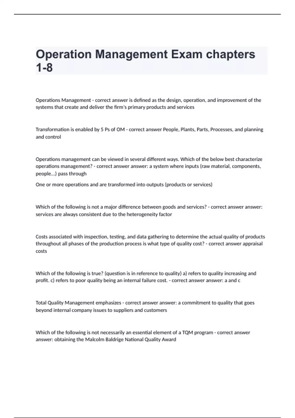 Operations Management - correct answer is defined as the design, operation, and improvement of the systems that create and deliver the firm's primary products and services Transformation is enabled by 5 Ps of OM - correct answer People, Plants, Parts, Processes, and planning and control Operations management can be viewed in several different ways. Which of the below best characterize operations management? - correct answer answer: a system where inputs (raw material, components, people...) pass through One or more operations and are transformed into outputs (products or services) Which of the following is not a major difference between goods and services? - correct answer answer: services are always consistent due to the heterogeneity factor Costs associated with inspection, testing, and data gathering to determine the actual quality of products throughout all phases of the production process is what type of quality cost? - correct answer appraisal costs Which of the following is true? (question is in reference to quality) a) refers to quality increasing and profit. c) refers to poor quality being an internal failure cost. - correct answer answer: a and c Total Quality Management emphasizes - correct answer answer: a commitment to quality that goes beyond internal company issues to suppliers and customers Which of the following is not necessarily an essential element of a TQM program - correct answer answer: obtaining the Malcolm Baldrige National Quality Award