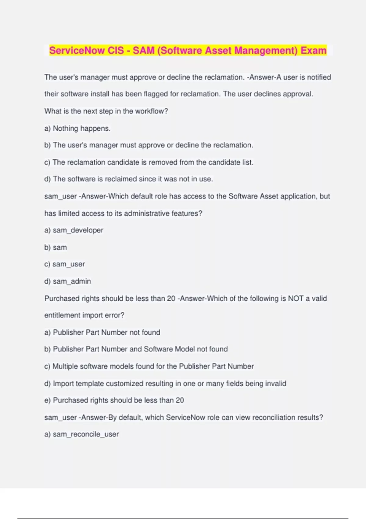 ServiceNow CIS - SAM (Software Asset Management) Exam The user's manager must approve or decline the reclamation. -Answer-A user is notified their software install has been flagged for reclamation. The user declines approval. What is the next step in the workflow? a) Nothing happens. b) The user's manager must approve or decline the reclamation. c) The reclamation candidate is removed from the candidate list. d) The software is reclaimed since it was not in use. sam_user -Answer-Which default role has access to the Software Asset application, but has limited access to its administrative features? a) sam_developer b) sam c) sam_user d) sam_admin Purchased rights should be less than 20 -Answer-Which of the following is NOT a valid entitlement import error? a) Publisher Part Number not found b) Publisher Part Number and Software Model not found c) Multiple software models found for the Publisher Part Number d) Import template customized resulting in one or many fields being invalid e) Purchased rights should be less than 20 sam_user -Answer-By default, which ServiceNow role can view reconciliation results? a) sam_reconcile_user b) sam_user c) sam_viewer d) sam_cmdb_user a) Create Allocations c) Remove Allocations d) Purchase Rights f) Remove Unlicensed Installs -Answer-Which of the following remediation options may be available after a reconciliation has been run? (select 4) a) Create Allocations b) Create New Model c) Remove Allocations d) Purchase Rights e) Remove Entitlements f) Remove Unlicensed Installs Remove unlicensed installations -Answer-In addition to creating a new purchase order for software licenses, additional remediation options are available in Software Model results to: a) Update license metrics b) Create allocations c) Remove unlicensed installations d) Remove software products a) Total Spend c) True-up Cost d) Potential Savings f) Over-licensed amount -Answer-Which of the following calculations are provided for publishers on the license workbench? (Select four.) a) Total Spend b) Number of unlicensed installs c) True-up Cost d) Potential Savings e) License Metric Results f) Over-licensed amount Software Entitlement -Answer-The license metric field is by default, displayed on which record form within ServiceNow? a) Software Model b) Software Allocations c) Software Entitlement d) Software Types Fully normalized -Answer-Which of the following is an invalid software normalization status? a) New b) Fully normalized c) Manually normalized d) Publisher normalized e) Match not found Discovery, Import Data, Manual -Answer-What are three ways to get software asset data into ServiceNow? a) Clone, Background Script, Discovery b) Import Data, Plugin, Clone c) Discovery, Import Data, Manual d) Plugin, Background Script, Manual Maintain compliance Optimize spend Support software audits -Answer-The goals of SAM are Software allocation -Answer-One or more use rights assigned to a specific device or user. Software normalization -Answer-The process of standardizing discovered software installation data to defined norms. Software reconciliation -Answer-The process of producing a compliance position by comparing the number of software rights acquired against the normalized software inventory. Software remediation -Answer-Options for resolving license rights compliance issues identified during reconciliation. Software reclamation -Answer-The process of identifying unused software and uninstalling it so that the software rights for the user or