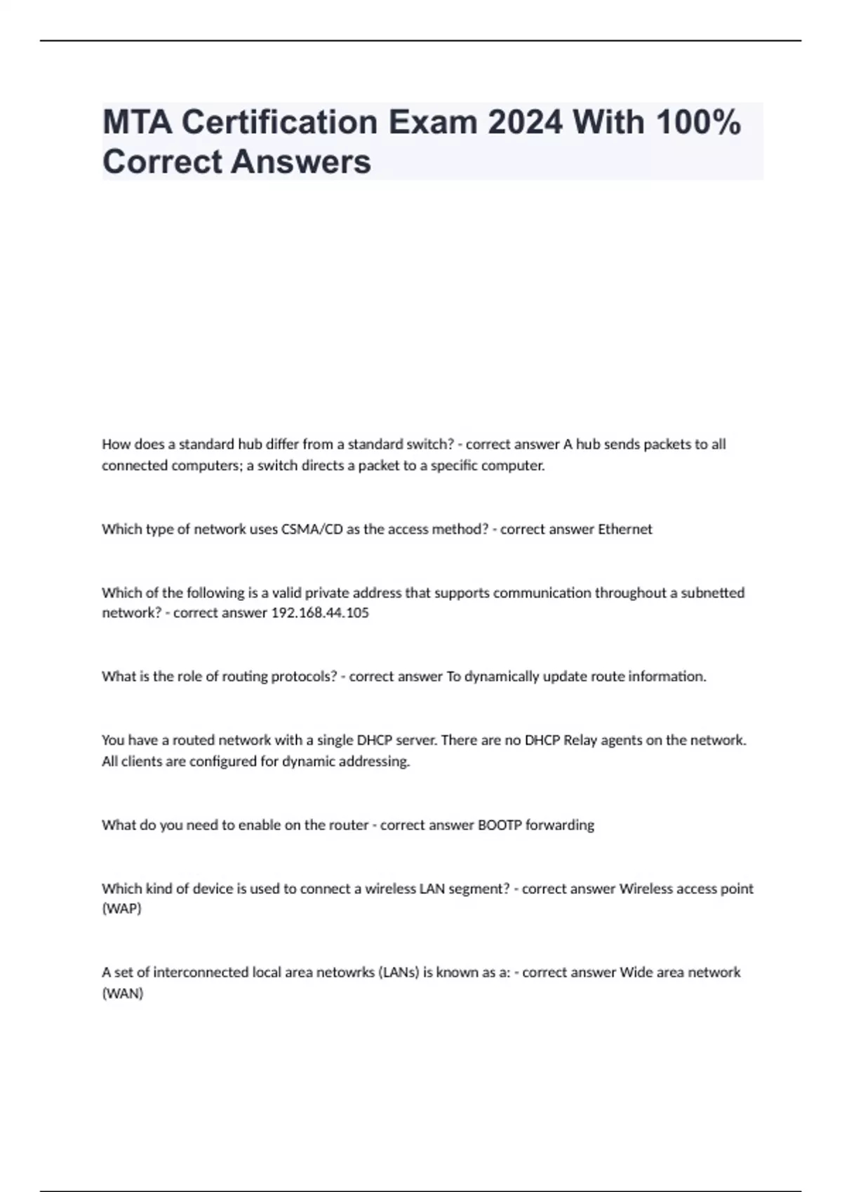 How does a standard hub differ from a standard switch? - correct answer A hub sends packets to all connected computers; a switch directs a packet to a specific computer. Which type of network uses CSMA/CD as the access method? - correct answer Ethernet Which of the following is a valid private address that supports communication throughout a subnetted network? - correct answer 192.168.44.105 What is the role of routing protocols? - correct answer To dynamically update route information. You have a routed network with a single DHCP server. There are no DHCP Relay agents on the network. All clients are configured for dynamic addressing. What do you need to enable on the router - correct answer BOOTP forwarding Which kind of device is used to connect a wireless LAN segment? - correct answer Wireless access point (WAP) A set of interconnected local area netowrks (LANs) is known as a: - correct answer Wide area network (WAN) Which method does a DHCP client use to locate a DHCP server? - correct answer Broadcast An infrastructure mode WLAN - correct answer Can be used to connect wireless clients to a wired network. Your network is configured to allow selected business partners access to resources on your internal network through virtual private network (VPN) connection. This is an example of an - correct answer extranet A firewall separates a management workstation from a router. You ned to manage the router using telnet with out specifying a port. Which traffic must the firewall allow? - correct answer Traffic on port 23 ADSL - correct answer Allocates more bandwidth for download traffic than for upload traffic Which tool can you use to delete the entries in the Domain Name System (DNS) cache on a client computer? - correct answer Ipconfig Which method of configuring a VLAN offers the best scalability? - correct answer Frame tagging Which two utilities can you use to identify a router that is experiencing problems? - correct answer Pathping Tracert Windows Internet Name Service( WINS) is used to map - correct answer NetBIOS names to IP addresses Computers connected to an Ethernet hub is an example of which topology? - correct answer Star