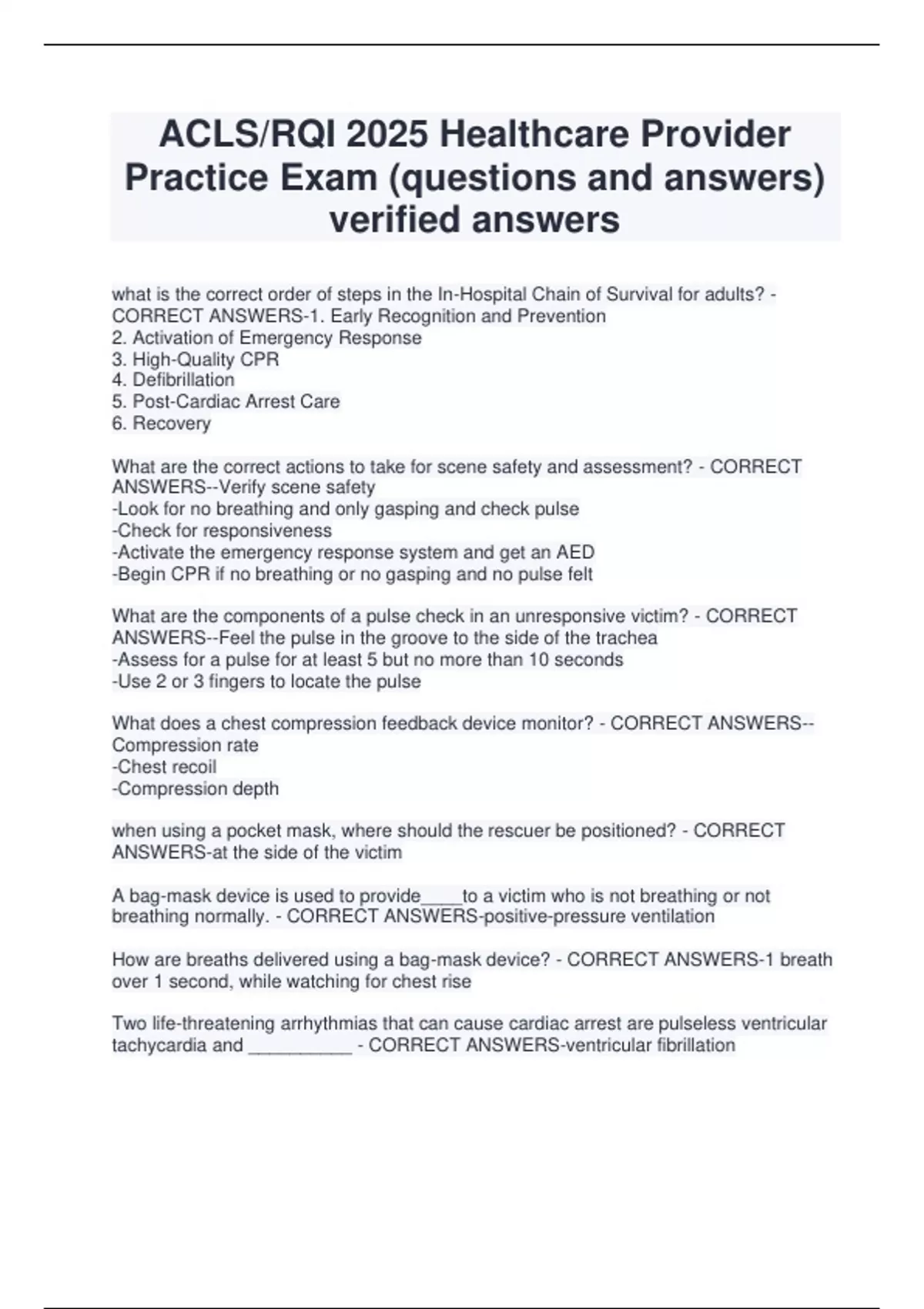 ACLS/RQI 2025 Healthcare Provider Practice Exam (questions and answers) verified answers what is the correct order of steps in the In-Hospital Chain of Survival for adults? - CORRECT ANSWERS-1. Early Recognition and Prevention 2. Activation of Emergency Response 3. High-Quality CPR 4. Defibrillation 5. Post-Cardiac Arrest Care 6. Recovery What are the correct actions to take for scene safety and assessment? - CORRECT ANSWERS--Verify scene safety -Look for no breathing and only gasping and check pulse -Check for responsiveness -Activate the emergency response system and get an AED -Begin CPR if no breathing or no gasping and no pulse felt What are the components of a pulse check in an unresponsive victim? - CORRECT ANSWERS--Feel the pulse in the groove to the side of the trachea -Assess for a pulse for at least 5 but no more than 10 seconds -Use 2 or 3 fingers to locate the pulse What does a chest compression feedback device monitor? - CORRECT ANSWERS-- Compression rate -Chest recoil -Compression depth when using a pocket mask, where should the rescuer be positioned? - CORRECT ANSWERS-at the side of the victim A bag-mask device is used to provide____to a victim who is not breathing or not breathing normally. - CORRECT ANSWERS-positive-pressure ventilation How are breaths delivered using a bag-mask device? - CORRECT ANSWERS-1 breath over 1 second, while watching for chest rise Two life-threatening arrhythmias that can cause cardiac arrest are pulseless ventricular tachycardia and __________ - CORRECT ANSWERS-ventricular fibrillation After an AED delivers a shock, what should the rescuers do next? - CORRECT ANSWERS-Resume CPR, starting with chest compressions How do you open the airway for breaths if a single rescuer is present? - CORRECT ANSWERS-Head tilt-chin lift After positioning yourself directly above the victim's head, what is the correct order of steps for using a bag-mask device? - CORRECT ANSWERS-1. Place the mask on the victim's face, using the bridge of the nose as a guide for the correct position. 2. Use the E-C clamp techinque to hold the maks in place while you life the jaw to hold the airway open 3. Squeeze the bad to give breaths (1 second each) while watching for chest rise Why is an AED needed? - CORRECT ANSWERS-to analyze the heart rhythm and provide a shock After an AED delivers a shock, what should the rescuers do next? - CORRECT ANSWERS-Resume CPR, starting with chest compressions When should the rescuer operating the AED clear the victim? - CORRECT ANSWERSDuring analysis and before shock delivery Where should AED pads be placed in the anteroposterior placement for adults and children 8 years and older? - CORRECT ANSWERS-Left side of the back and Left side of the chest You and your colleague respond to an adult victim who is unresponsive. After assessing that the victim is not breathing and has no pulse, what do you instruct your colleague to do? - CORRECT ANSWERS-Activate the emergency response system and get the AED You tap and shout to check for responsiveness, but the patient does not respond. What is your next step after calling for help? - CORRECT ANSWERS-Check for breathing and a pulse After checking for breathing and a pulse, you find that the patient is not breathing normally but had a pulse and needs rescue breathing. What is the correct ventilation rate? - CORRECT ANSWERS-1 breath every 6 seconds, or about 10 breaths per minute After 4 minutes of rescue breathing, no pulse is present during a pulse check. What immediate actions should be taken? - CORRECT ANSWERS-Immediately begin CPR and turn on the AED