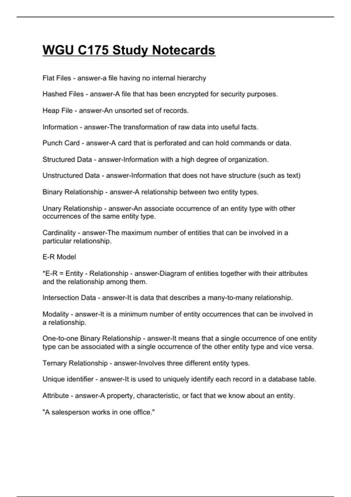 Flat Files - answer-a file having no internal hierarchy Hashed Files - answer-A file that has been encrypted for security purposes. Heap File - answer-An unsorted set of records. Information - answer-The transformation of raw data into useful facts. Punch Card - answer-A card that is perforated and can hold commands or data. Structured Data - answer-Information with a high degree of organization. Unstructured Data - answer-Information that does not have structure (such as text) Binary Relationship - answer-A relationship between two entity types. Unary Relationship - answer-An associate occurrence of an entity type with other occurrences of the same entity type. Cardinality - answer-The maximum number of entities that can be involved in a particular relationship. E-R Model *E-R = Entity - Relationship - answer-Diagram of entities together with their attributes and the relationship among them. Intersection Data - answer-It is data that describes a many-to-many relationship. Modality - answer-It is a minimum number of entity occurrences that can be involved in a relationship. One-to-one Binary Relationship - answer-It means that a single occurrence of one entity type can be associated with a single occurrence of the other entity type and vice versa. Ternary Relationship - answer-Involves three different entity types. Unique identifier - answer-It is used to uniquely identify each record in a database table. Attribute - answer-A property, characteristic, or fact that we know about an entity. "A salesperson works in one office." What is the name of this relationship? - answer-One-to-one binary relationship "A salesperson sells to many customers." What is the name of this relationship? - answer-One-to-many binary relationship "A salesperson is authorized to sell many products, and a product can be sold by many salespersons." What is the name of this relationship? - answer-Many-to-many binary relationship What is the positioning and meaning for Cardinality and Modality on an E-R model? - answer-Cardinality is the outer symbol; represents the maximum. Modality is the inner symbol; represents the minimum. "A salesperson works in a minimum of one and a maximum of one office, and an office may be occupied by or assigned to a minimum of zero and a maximum of one salesperson." - answer- "A salesperson may have no customers or many customers." - answer- Describe the ER model for "Each salesperson is authorized to sell to at least one or many products, and each product can be sold by at least one or many salespeople." - answer- "One salesperson backs-up another salesperson." What is the name of this model? - answer-One-to-one unary relationship "A salesperson manages zero to many other salespersons, and a salesperson is managed by exactly one other salesperson." What is the name of this model? - answer-One-to-many unary relationship "A product can either be part of no other products or be part of several other products, and a product can either be composed of no other products or be composed of several other products." What is the name of this model? - answer-Many-to-many unary relationship What does 'refer' in Referential Integrity imply? - answer-This revolves around the circumstance of trying to refer to data in one relation in the database, based on values in another relation. Define the delete rule RESTRICT. - answer-If the delete rule between two relations is RESTRICT and an attempt is made to delete a record on the "one side" of the one-to-many relationship, the system will forbid the delete to take place if there are any matching foreign key values in the relation on the "many side". Define the delete rule CASCADE. - answer-If the delete rule between two relations is CASCADE and an attempt is made to delete a record on the "one side" of the relationship, not only will the record be deleted but all of the records on the "many side" of the relationship that have a matching foreign key value will also be deleted. In other words, the delete will "cascade" from one relation to the other. Define the delete rule SET-TO-NULL. - answer-If the delete rule between the two relations is SET-TO-NULL and an attempt is made to delete a record on the "one side" of the one-to-many relationship, that record will be deleted and the matching foreign key values in the records on the "many side" of the relationship will be set to null. Essentially, it's exactly like the CASCADE delete option, but instead of completely deleting all possible values, the values are set to NULL instead. Which entity is uniquely identified by concatenating the primary keys of the two entities it connects? - answer-Associative Entity