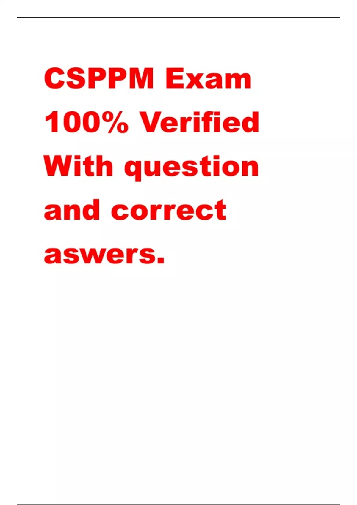 CSPPM Exam 100% Verified With question and correct aswers. Which of the following is NOT a key component of E/M services? - -Time A _ budget is prepared under the single assumption about the anticipated activity level. - - Fixed Which statement is false regarding Directors and Officers (D&O) insurance? - -It does not offer protection against liability judgments resulting from an action by dissatisfied shareholders for decisions that were made in good faith Which option is NOT one of the four major system design options? - -Turn the project over to a consultant to do without further input from staff Which option is NOT true concerning a budget manual? - -It is particularly valuable in small private and nonprofit organizations All of the following are impacts of the E/M coding changes, EXCEPT __________. - -Reduced Ability to code on total time What does casualty insurance protect in a medical practice? - -property damage or loss Which option is NOT a true statement regarding the IRS? - -The IRS is charged with ensuring that practices are maintaining a non-profit status Why do healthcare organizations continue to seek strategic business affiliations? - -In an effort to seek competitiveness in the marketplace Which option is NOT a source of capital? - -Statistics Which of the following is NOT an activity leading to the final selection of an information system vendor? - -Location analysis The authority to license a physician rests with the __________. - -State in which he or she intends to practice RVU's can be used in physician practice administration in all of the following ways, EXCEPT - - Reviewing physician practice quality Which option is NOT a method used to monitor progress in carrying out strategies/tactics and success in achieving goals/objectives? - -Data Analysis Which option is NOT a protocol to general system security? - -System Software Which option is NOT an area where internal controls are particularly critical? - -Areas where budgets are generated Which option is NOT true regarding the contract evaluation model? - -It identifies and prioritizes desired contract features before entering into contract negotiations What is the purpose of general liability insurance? - -To cover general liability events that occur on property business The physician malpractice insurance market switched to claims made due to all of the following, EXCEPT ____________. - -Insurers were able to sell occurrence-based coverage for a higher premium All of the following are examples of capitated receivables goals, EXCEPT ________. - - Depositing the capitation check within 30 days of receipt Which option is NOT an accounts receivable function that most immediately benefits from electronic information systems management? - -staff scheduling What does the term credentialing mean? - -An official review of the various information and qualifications of a physician and other licensed clinicians who have applied to participate in a system or plan.