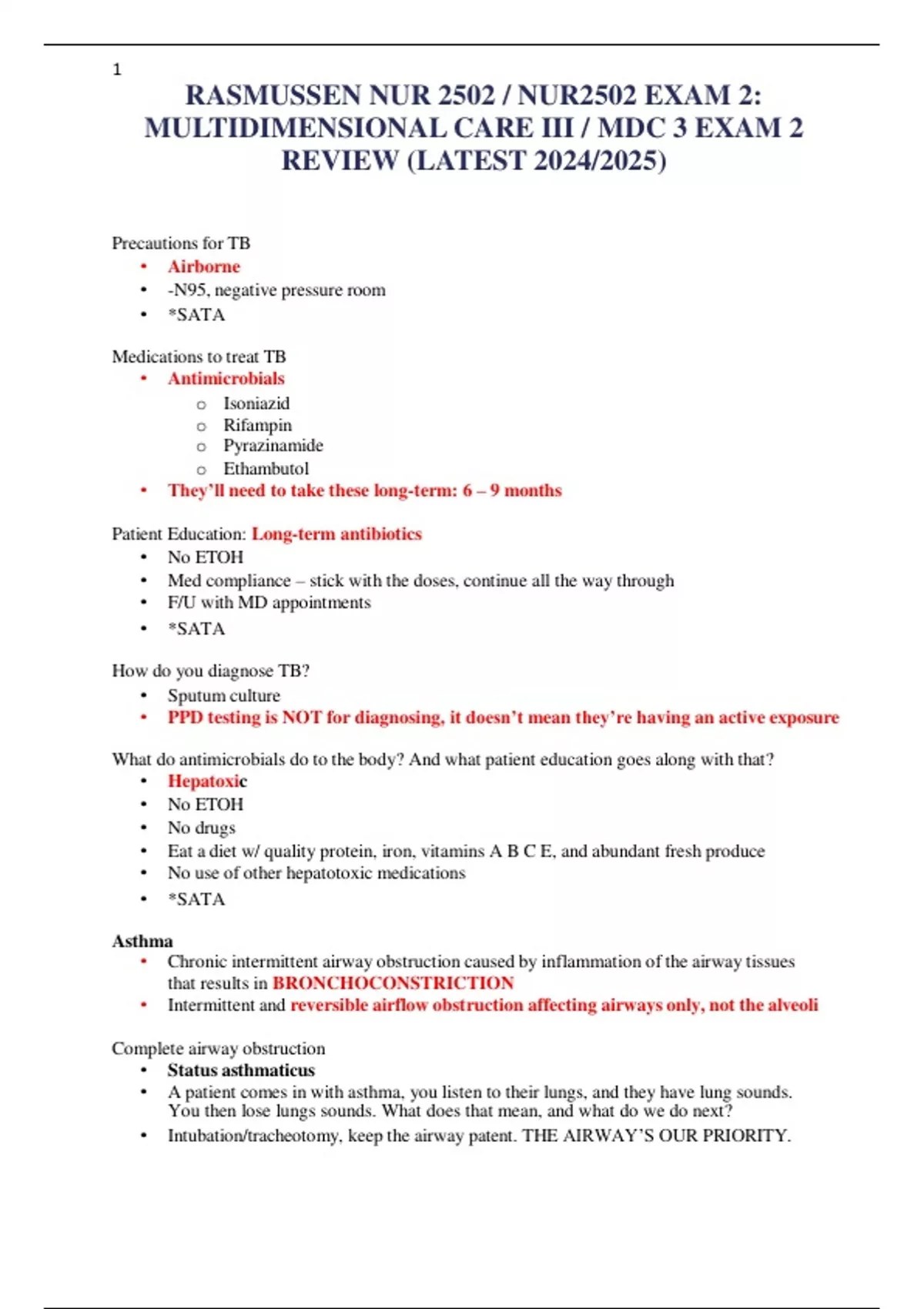 RASMUSSEN NUR 2502 / NUR2502 EXAM 2: MULTIDIMENSIONAL CARE III / MDC 3 EXAM 2 REVIEW (LATEST 2024/2025)