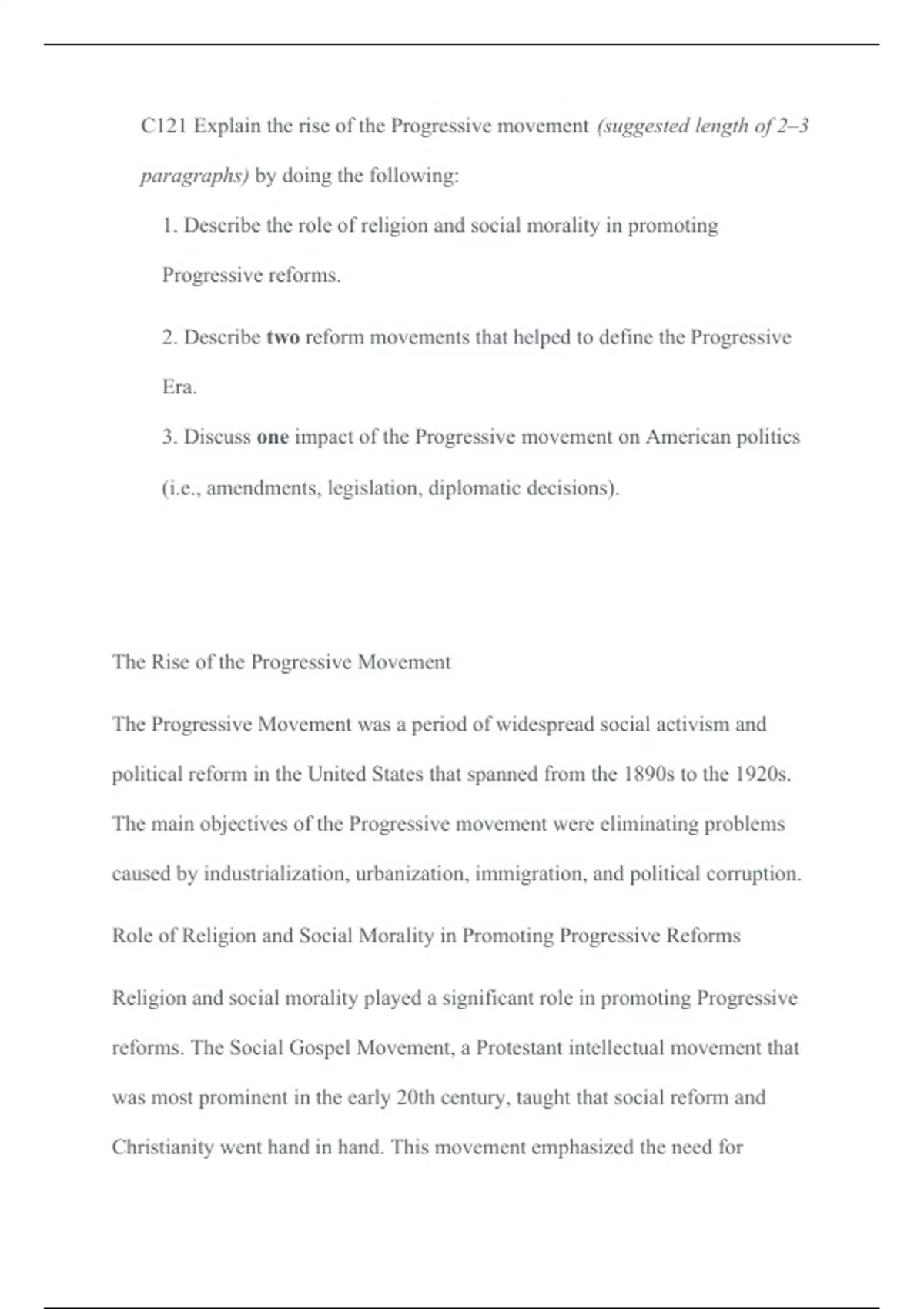 C121 Explain the rise of the Progressive movement (suggested length of 2“3 paragraphs) by C121 Explain the rise of the Progressive movement (suggested length of 2“3 paragraphs) by doing the following: 1. Describe the role of religion and social morality in promoting Progressive reforms. 2. Describe two reform movements that helped to define the Progressive Era. 3. Discuss one impact of the Progressive movement on American politics (i.e., amendments, legislation, diplomatic decisions). The Rise of the Progressive MovementThe Progressive Movement was a period of widespread social activism and political reform in the United States that spanned from the 1890s to the 1920s. The main obj