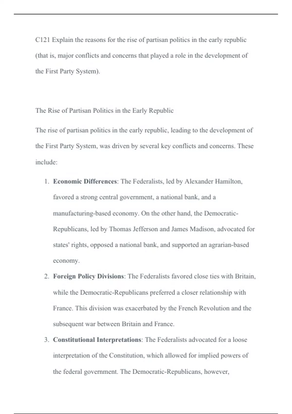 C121 Explain the reasons for the rise of partisan politics in the early republic (that is, C121 Explain the reasons for the rise of partisan politics in the early republic (that is, major conflicts and concerns that played a role in the development of the First Party System).The Rise of Partisan Politics in the Early RepublicThe rise of partisan politics in the early republic, leading to the development of the First Party System, was driven by several key conflicts and concerns. These include:1.Economic Differences: The Federalists, led by Alexander Hamilton, favored a strong central government, a national bank, and a manufacturing-based economy. On the other hand, the Democratic-Re