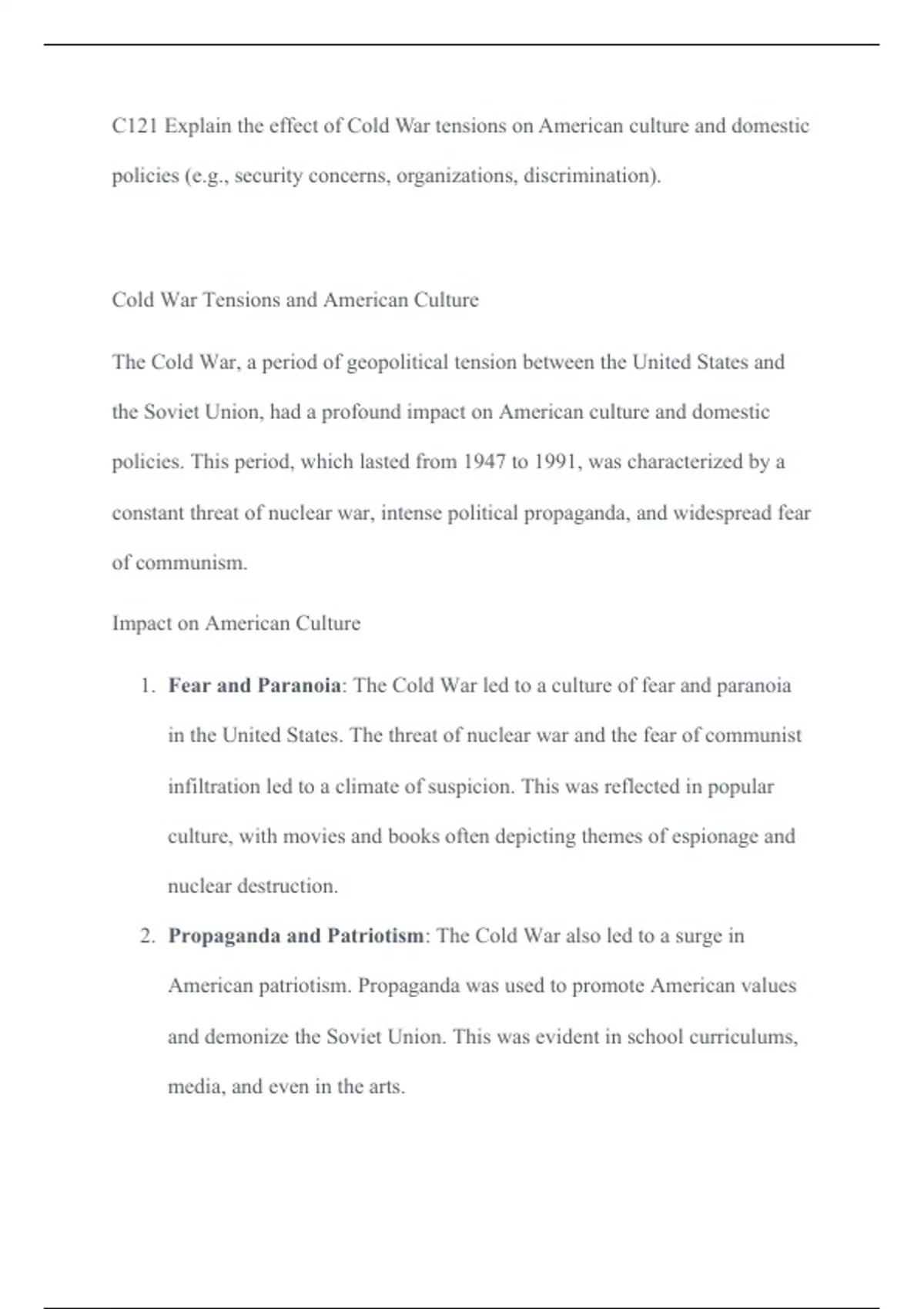 C121 Explain the effect of Cold War tensions on American culture and domestic policies (e. C121 Explain the effect of Cold War tensions on American culture and domestic policies (e.g., security concerns, organizations, discrimination).Cold War Tensions and American CultureThe Cold War, a period of geopolitical tension between the United States and the Soviet Union, had a profound impact on American culture and domestic policies. This period, which lasted from 1947 to 1991, was characterized by a constant threat of nuclear war, intense political propaganda, and widespread fear of communism.Impact on American Culture1.Fear and Paranoia: The Cold War led to a culture of fear and parano