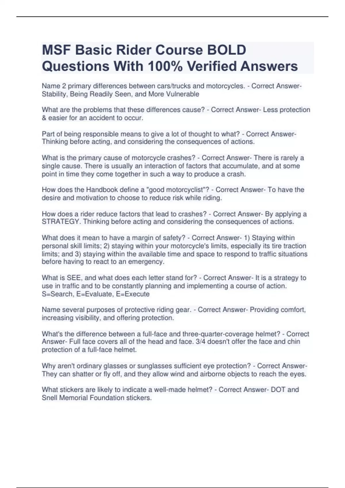 MSF Basic Rider Course BOLD Questions With 100% Verified Answers