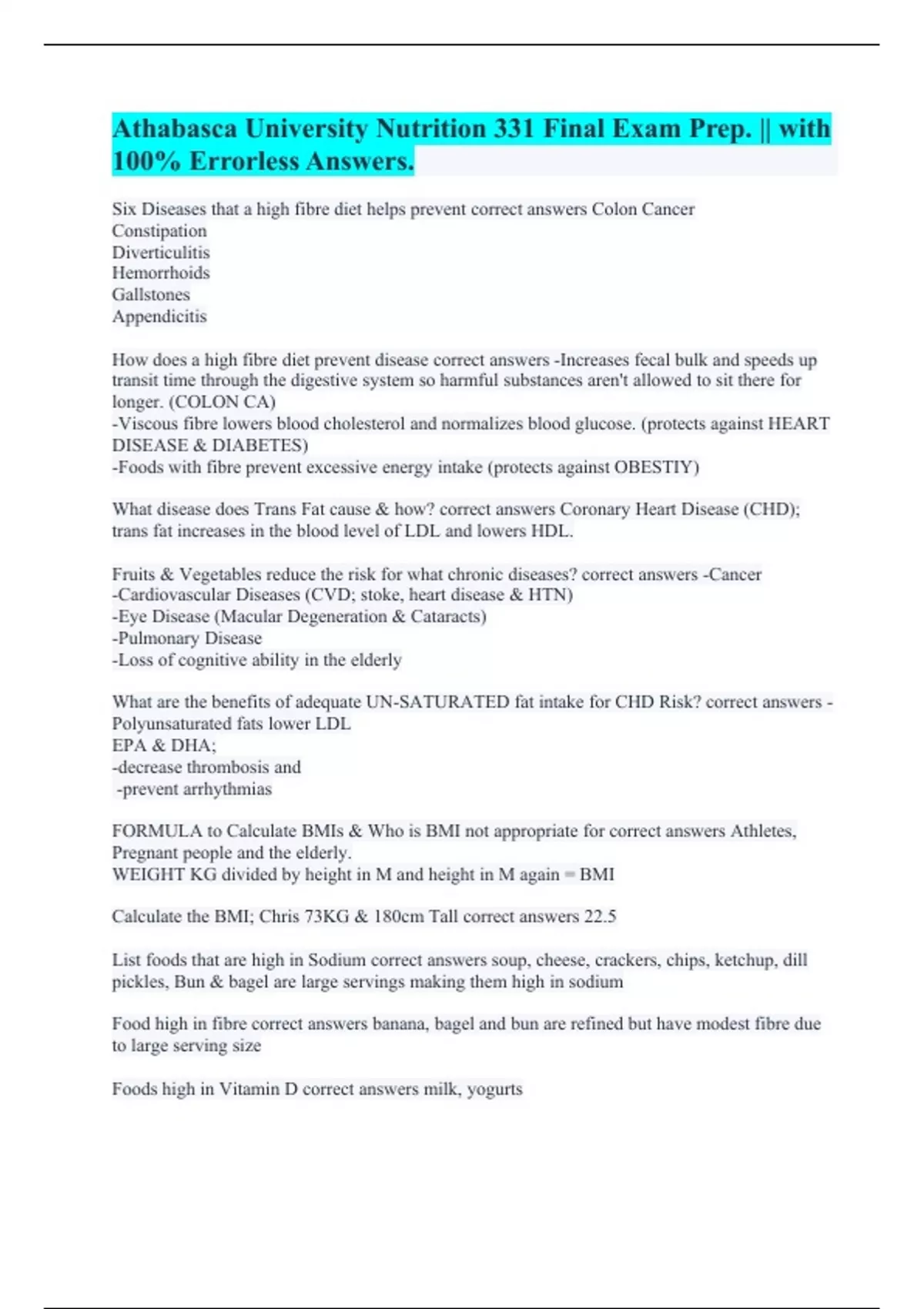Athabasca University Nutrition 331 Final Exam Prep. || with 100% Errorless Answers.