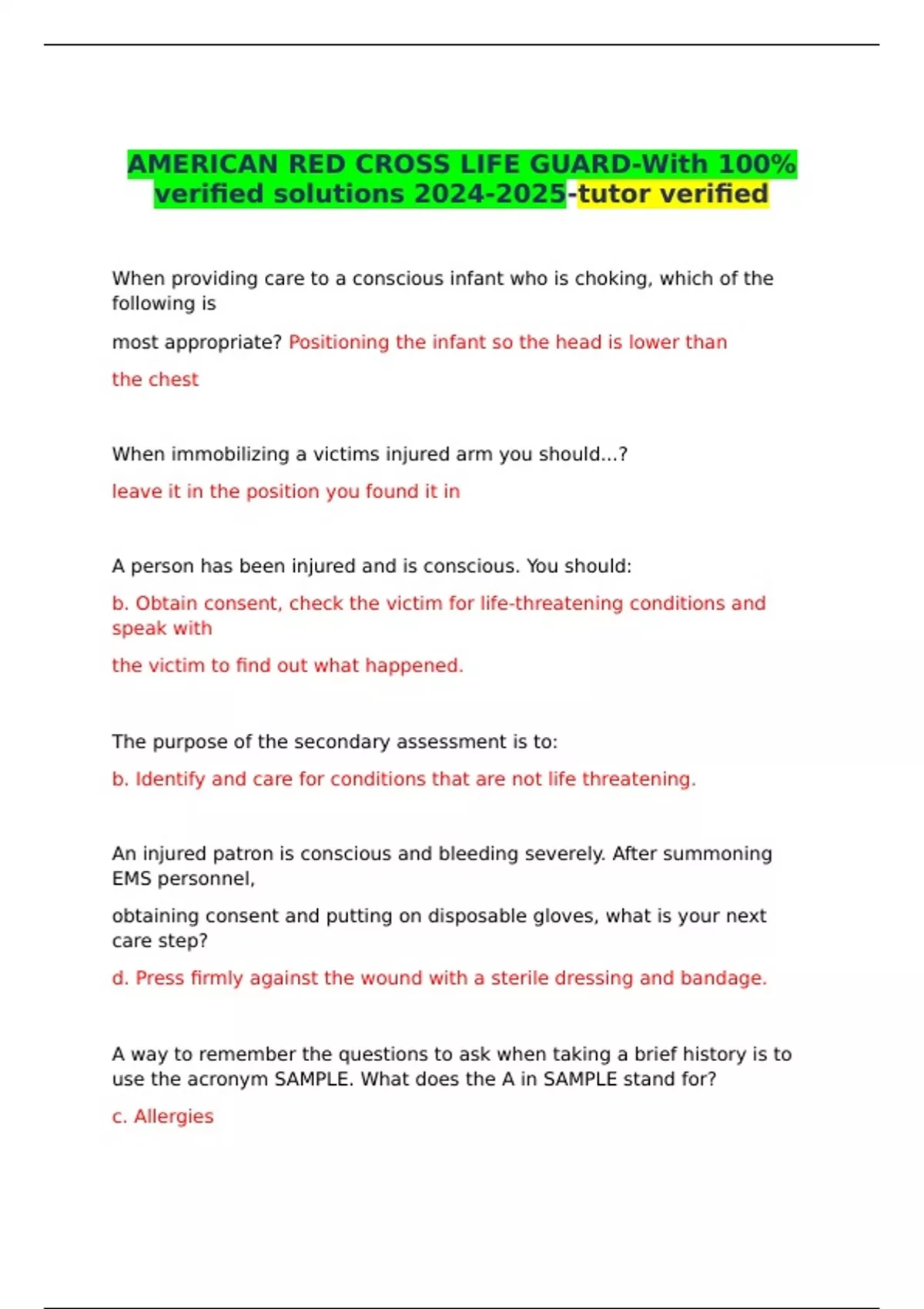 AMERICAN RED CROSS LIFE GUARD-With 100% verified solutions -tutor verified