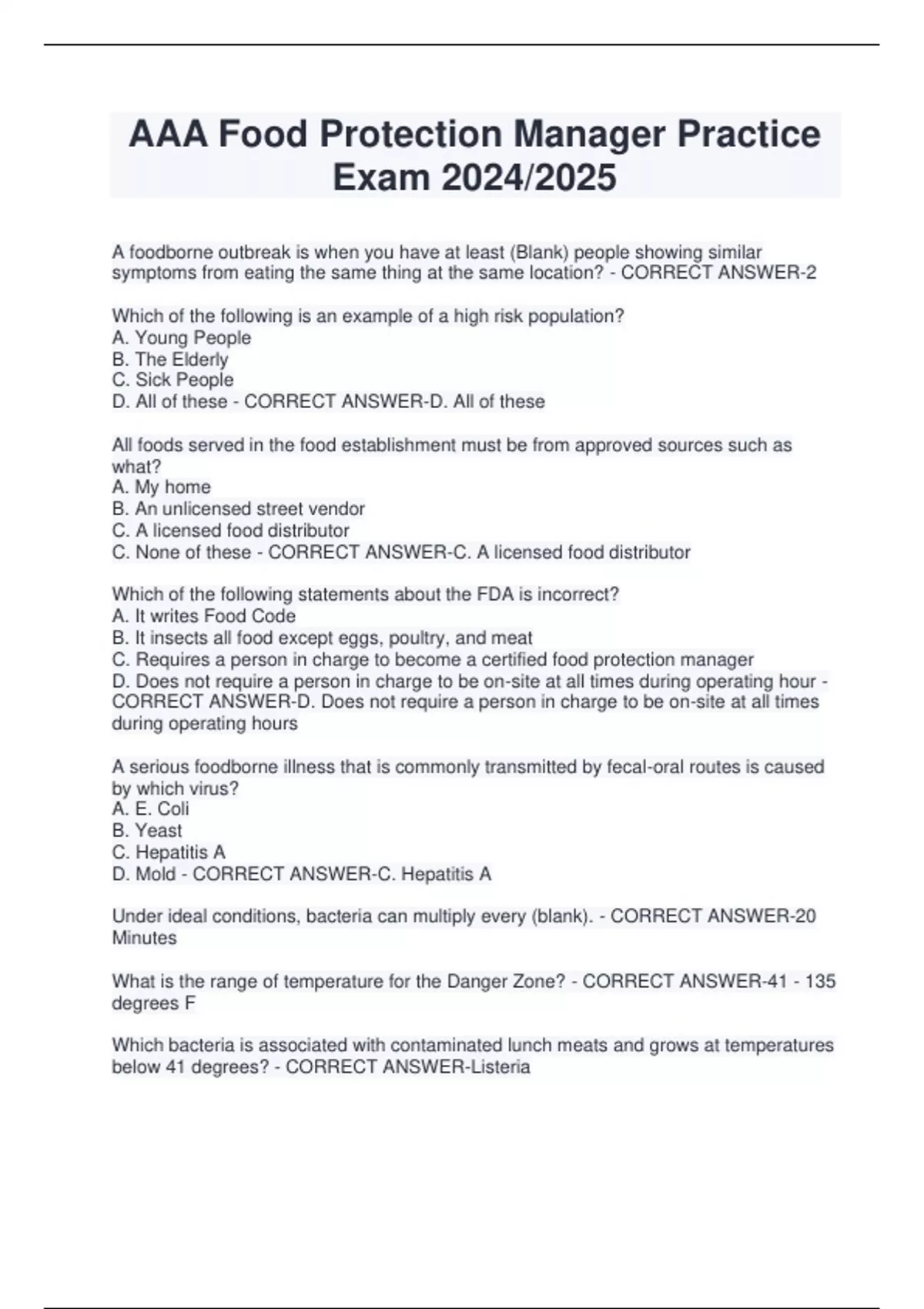 AAA Food Protection Manager Practice Exam 2024/2025 A foodborne outbreak is when you have at least (Blank) people showing similar symptoms from eating the same thing at the same location? - CORRECT ANSWER-2 Which of the following is an example of a high risk population? A. Young People B. The Elderly C. Sick People D. All of these - CORRECT ANSWER-D. All of these All foods served in the food establishment must be from approved sources such as what? A. My home B. An unlicensed street vendor C. A licensed food distributor C. None of these - CORRECT ANSWER-C. A licensed food distributor Which of the following statements about the FDA is incorrect? A. It writes Food Code B. It insects all food except eggs, poultry, and meat C. Requires a person in charge to become a certified food protection manager D. Does not require a person in charge to be on-site at all times during operating hour - CORRECT ANSWER-D. Does not require a person in charge to be on-site at all times during operating hours A serious foodborne illness that is commonly transmitted by fecal-oral routes is caused by which virus? A. E. Coli B. Yeast C. Hepatitis A D. Mold - CORRECT ANSWER-C. Hepatitis A Under ideal conditions, bacteria can multiply every (blank). - CORRECT ANSWER-20 Minutes What is the range of temperature for the Danger Zone? - CORRECT ANSWER-41 - 135 degrees F Which bacteria is associated with contaminated lunch meats and grows at temperatures below 41 degrees? - CORRECT ANSWER-Listeria