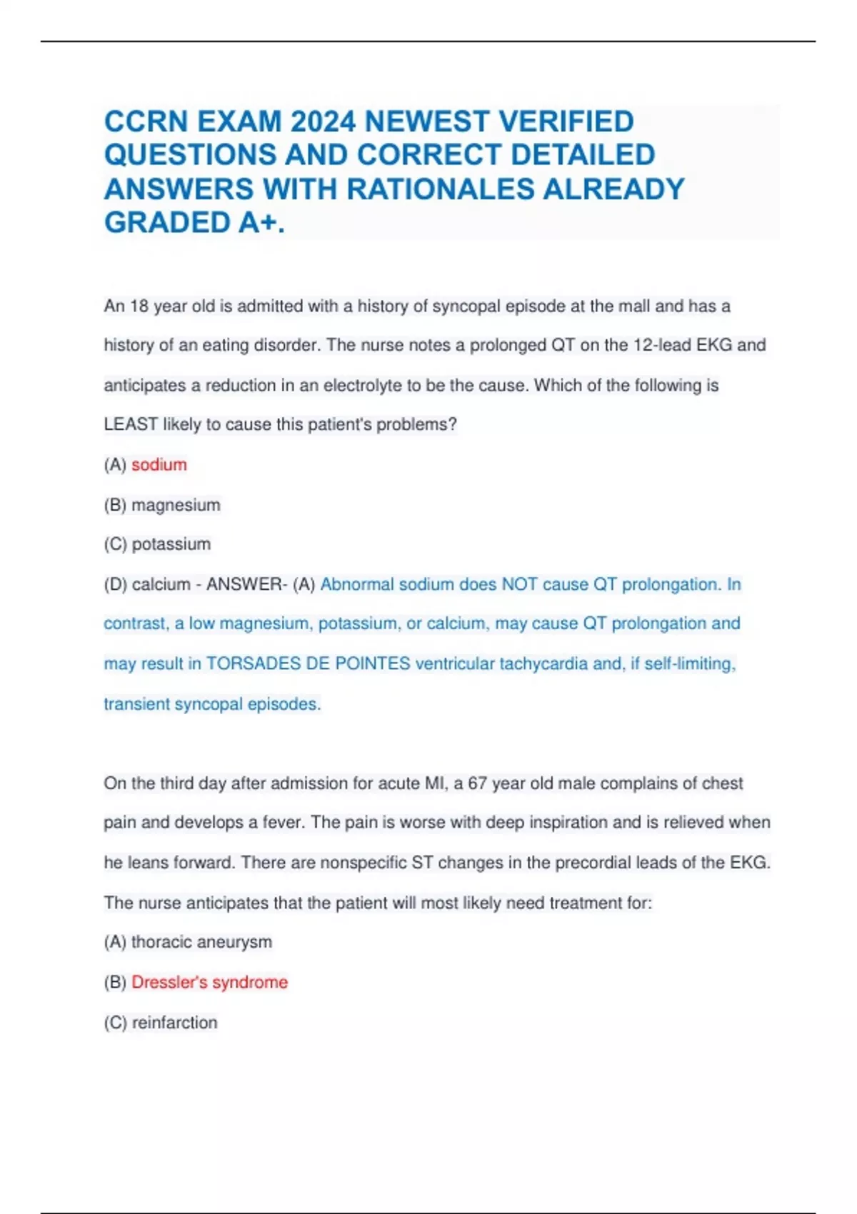 CCRN EXAM 2024 NEWEST VERIFIED QUESTIONS AND CORRECT DETAILED ANSWERS WITH RATIONALES ALREADY GRADED A+ An 18year old is admitted with a history of synopal episode of them all and has a history of an eating disorder. The nurse notes a prolonged QT on the 12-lead EKG and anticipates a reduction in an electrolyte to be the cause . Which of the following is LEAST likely to cause this patient problem?