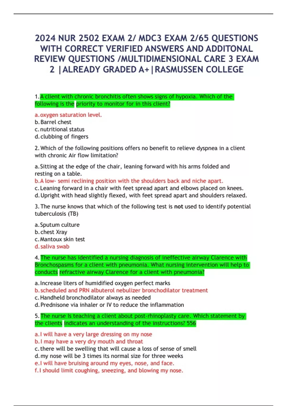 2024 NUR 2502 EXAM 2/ MDC3 EXAM 2/65 QUESTIONS WITH CORRECT VERIFIED ANSWERS AND ADDITONAL REVIEW QUESTIONS /MULTIDIMENSIONAL CARE 3 EXAM 2 |ALREADY GRADED A+|RASMUSSEN COLLEGE