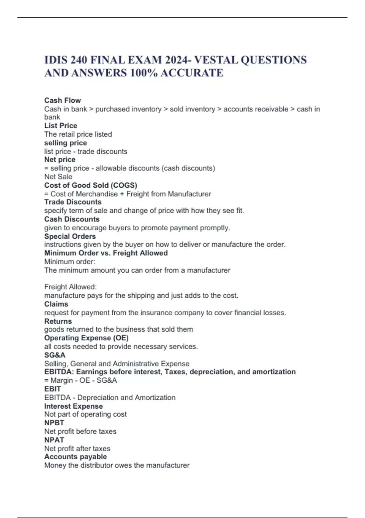IDIS 240 FINAL EXAM 2024- VESTAL QUESTIONS AND ANSWERS 100% ACCURATE Cash Flow Cash in bank > purchased inventory > sold inventory > accounts receivable > cash in bank List Price The retail price listed selling price list price - trade discounts Net price = selling price - allowable discounts (cash discounts) Net Sale Cost of Good Sold (COGS) = Cost of Merchandise + Freight from Manufacturer Trade Discounts specify term of sale and change of price with how they see fit. Cash Discounts given to encourage buyers to promote payment promptly. Special Orders instructions given by the buyer on how to deliver or manufacture the order. Minimum Order vs. Freight Allowed Minimum order: The minimum amount you can order from a manufacturer Freight Allowed: manufacture pays for the shipping and just adds to the cost. Claims request for payment from the insurance company to cover financial losses. Returns goods returned to the business that sold them Operating Expense (OE) all costs needed to provide necessary services. SG&A Selling, General and Administrative Expense EBITDA: Earnings before interest, Taxes, depreciation, and amortization = Margin - OE - SG&A EBIT EBITDA - Depreciation and Amortization Interest Expense Not part of operating cost NPBT Net profit before taxes NPAT Net profit after taxes Accounts payable Money the distributor owes the manufacturer