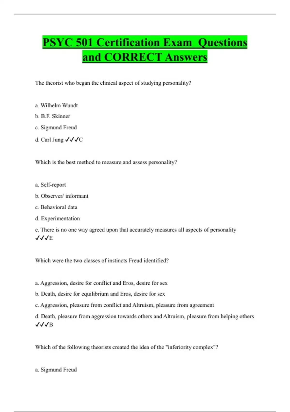The theorist who began the clinical aspect of studying personality? a. Wilhelm Wundt b. B.F. Skinner c. Sigmund Freud d. Carl Jung C Which is the best method to measure and assess personality? a. Self-report b. Observer/ informant c. Behavioral data d. Experimentation e. There is no one way agreed upon that accurately measures all aspects of personality E