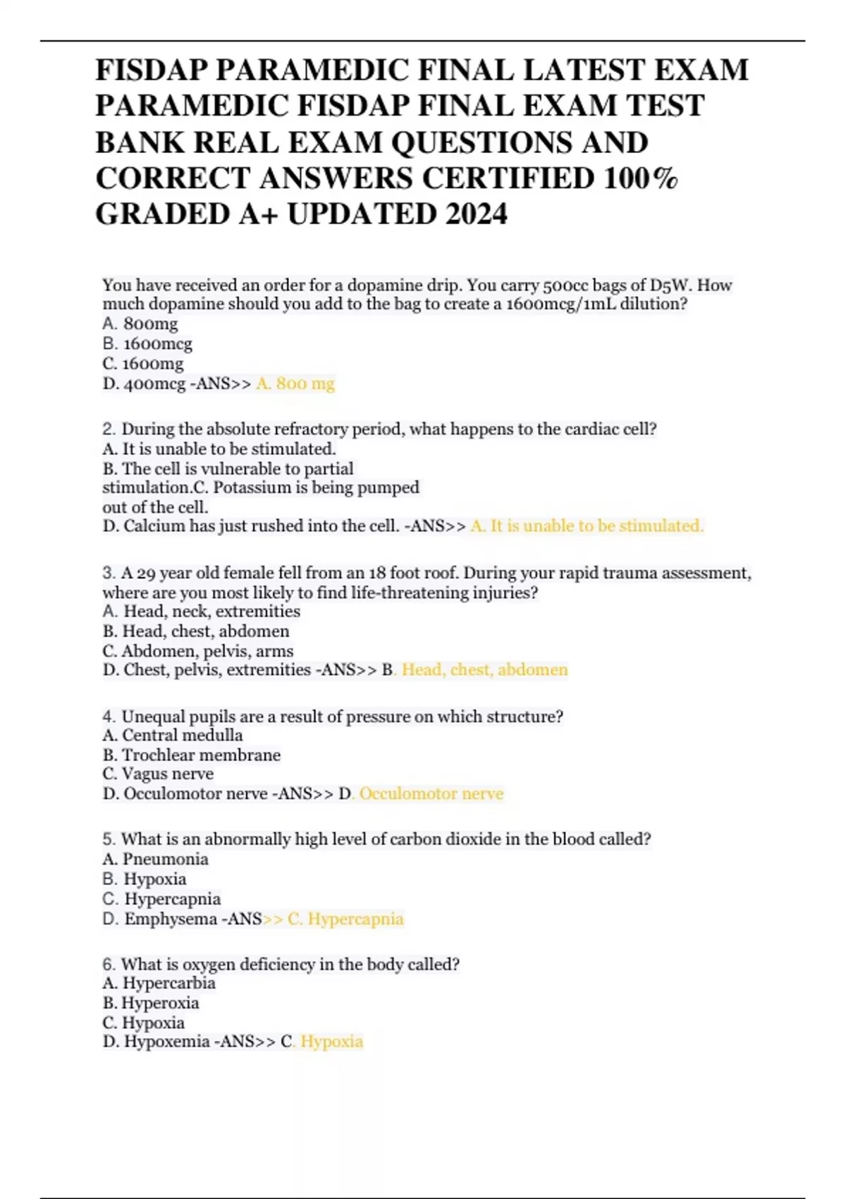 FISDAP PARAMEDIC FINAL LATEST EXAM PARAMEDIC FISDAP FINAL EXAM TEST BANK REAL EXAM QUESTIONS AND CORRECT ANSWERS CERTIFIED 100% GRADED A+ UPDATED 2024 FISDAP PARAMEDIC FINAL LATEST EXAM PARAMEDIC FISDAP FINAL EXAM TEST BANK REAL EXAM QUESTIONS AND CORRECT ANSWERS CERTIFIED 100% GRADED A+ UPDATED 2024