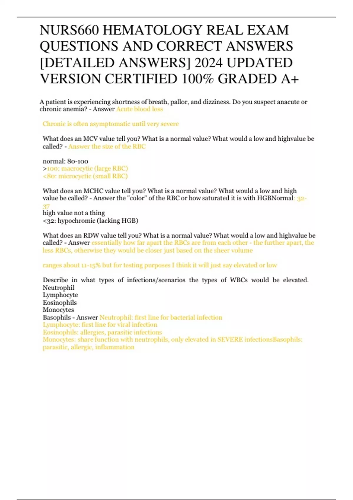 NURS660 HEMATOLOGY REAL EXAM QUESTIONS AND CORRECT ANSWERS [DETAILED ANSWERS] 2024 UPDATED VERSION CERTIFIED 100% GRADED A+ NURS660 HEMATOLOGY REAL EXAM QUESTIONS AND CORRECT ANSWERS [DETAILED ANSWERS] 2024 UPDATED VERSION CERTIFIED 100% GRADED A+