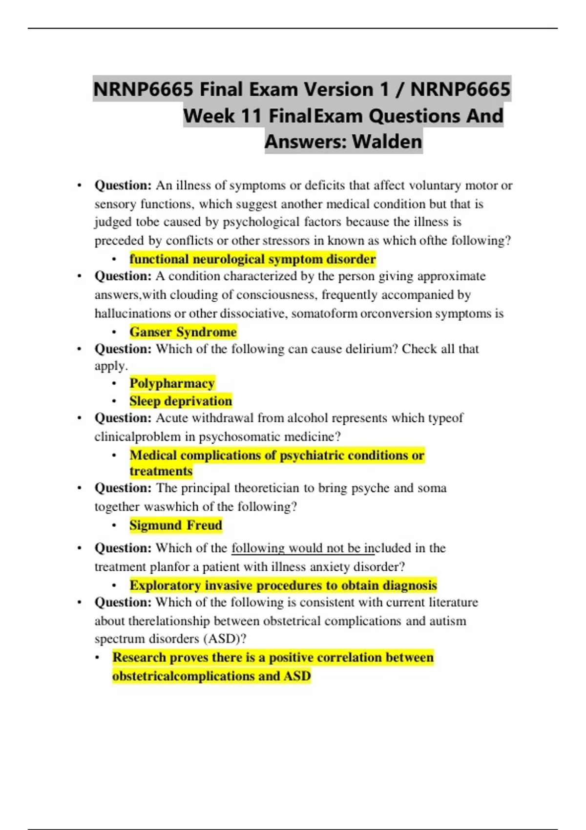 NRNP6665 Final Exam Version 1 / NRNP6665 Week 11 Final Exam Questions And Answers: Walden