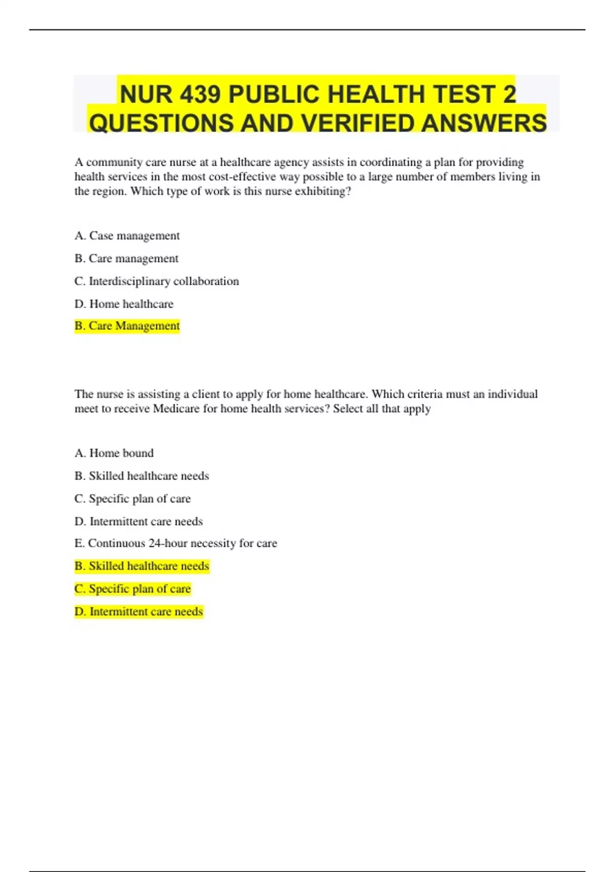 NUR 439 PUBLIC HEALTH TEST 2 QUESTIONS AND VERIFIED ANSWERSA community care nurse at a healthcare agency assists in coordinating a plan for providing health services in the most cost-effective way possible to a large number of members living in the region. Which type of work is this nurse exhibiting? A. Case management B. Care management C. Interdisciplinary collaboration D. Home healthcare B. Care Management The nurse is assisting a client to apply for home healthcare. Which criteria must an individual meet to receive Medicare for home health services? Select all that apply A. Home bound B. Skilled healthcare needs C. Specific plan of care D. Intermittent care needs E. Continuous 24-hour necessity for care B. Skilled healthcare needs C. Specific plan of care D. Intermittent care needs The community health nurse can receive a referral to a home health agency at any time. Which phases will this nurse most likely utilize in this process? Select all that apply. A. Preparation B. Plan personal safety of visit C. Actual visit D. Termination of the visit E. Initiating a visit A. Preparation C. Actual visit D. Termination of the visit E. Initiating a visit The client wants to know how long Medicare will pay for skilled needs. How long can the nurse continue to provide this care before she must seek a renewal if skilled needs continue to exist? A. 30 days B. 45 days C. 90 days D. 60 days D. 60 days The case manager for a 12-year-old boy who is obese and prediabetic. To help the client develop a diet that will promote weight loss and control of his glucose level, the case manager decides to consult with a dietician, who provides several current journal articles that present findings on various diets. Which aspect of case management is employed with this action? A. Interdisciplinary collaboration B. Advocacy C. Disease management D. Care management A. Interdisciplinary collaboration The community health nurses meets with families of all types. With each family, the nurse takes the time to discover each member's place and function within the family structure. Which concept is the nurse utilizing with this action? A. Exploring how the family is influenced by the community B. Evaluating how the family has progressed through the various stages C. Determining how well the family functions D. Predicting the type of family structure D. Predicting the type of family structure The nurse has noted an increase in the number of blended families in the community. Which reasons might the nurse attribute to this increase? Select all that apply. A. Married couples having children B. Couple cohabitating with children from prior relationships C. People who remain single after being widowed D. People who remarry following a divorce E. Recognized gay and lesbian relationships B. Couple cohabitating with children from prior relationships D. People who remarry following a divorce E. Recognized gay and lesbian relationships