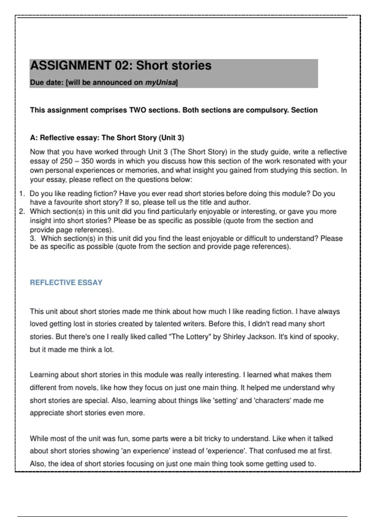 A: Reflective essay: The Short Story (Unit 3)