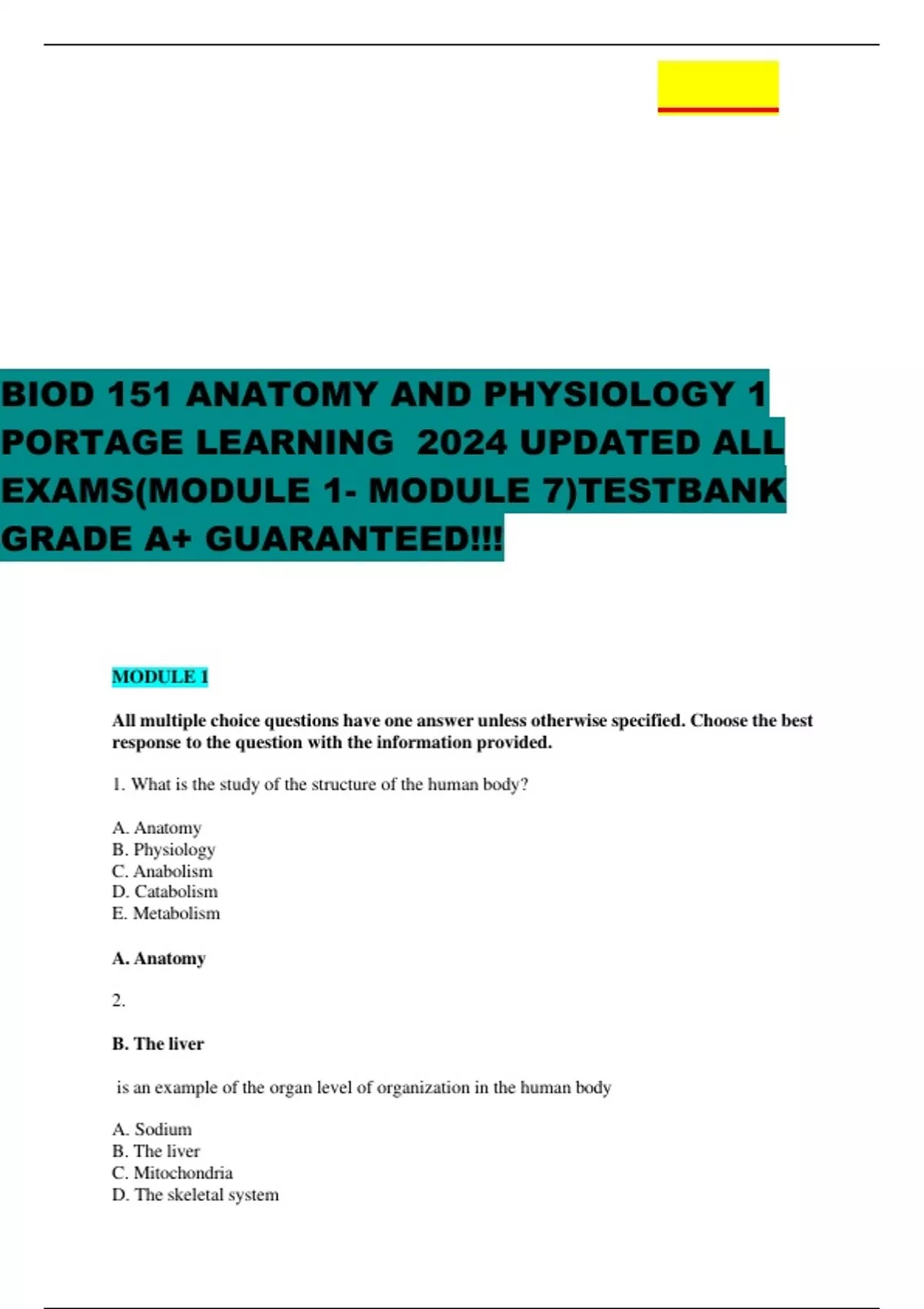 BIOD 151 ANATOMY AND PHYSIOLOGY 1 PORTAGE LEARNING 2024 UPDATED ALL EXAMS(MODULE 1- MODULE 7)TESTBANK GRADE A+ GUARANTEED!!!