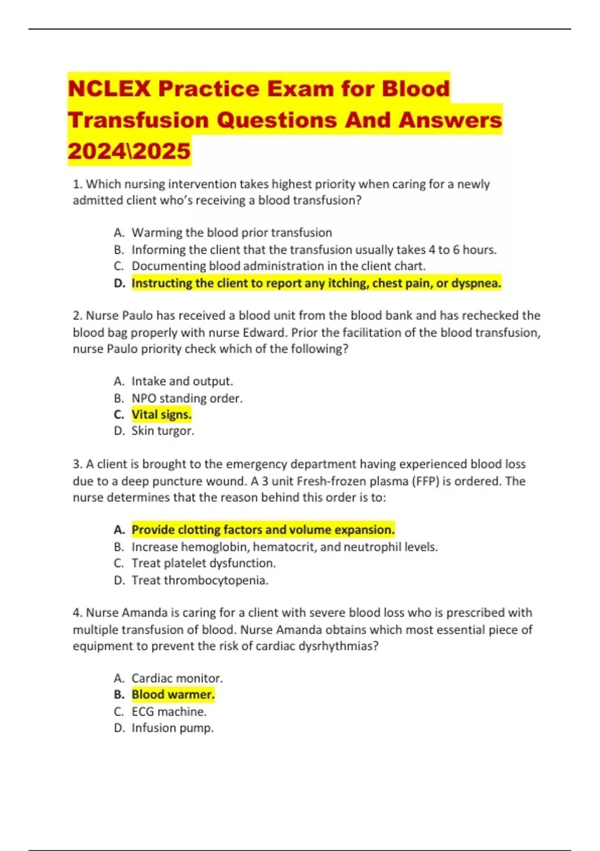 NCLEX Practice Exam for Blood Transfusion Questions And Answers