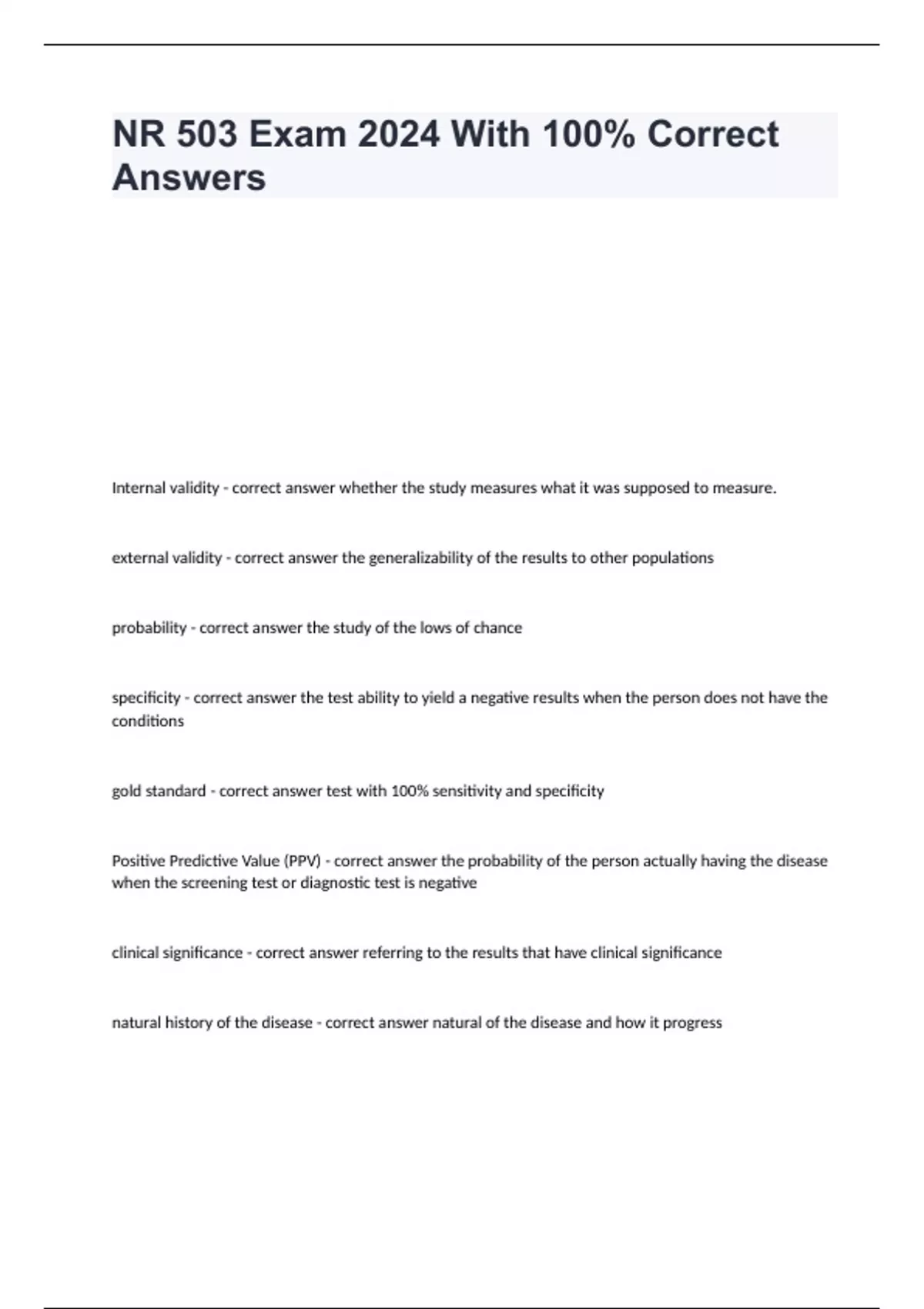 Internal validity - correct answer whether the study measures what it was supposed to measure. external validity - correct answer the generalizability of the results to other populations probability - correct answer the study of the lows of chance specificity - correct answer the test ability to yield a negative results when the person does not have the conditions gold standard - correct answer test with 100% sensitivity and specificity Positive Predictive Value (PPV) - correct answer the probability of the person actually having the disease when the screening test or diagnostic test is negative clinical significance - correct answer referring to the results that have clinical significance natural history of the disease - correct answer natural of the disease and how it progress primary prevention - correct answer refers to the process of altering susceptibility or reducing exposure to susceptible individuals and includes general health promotion and specific measures designed to prevent disease prior to a person getting the disease interventions aimed at preventing the condition, disorder, and disease educating to prevent disease secondary prevention - correct answer intervention aim at detecting the disease early in its source, ex screening for hypertension screening to identify the disease at the earliest stage tertiary prevention - correct answer strategies are implemented during the middle or late stages of clinical disease and refer to measures taken to alleviate disability and restore effective functioning. limiting the effects of the disease once is established ex rehabilitations programs. True Positive (TP) - correct answer occurs when the test correctly reports disease presence when disease is in fact present. false positive test - correct answer occurs when the test incorrectly reports disease presence when disease is in fact absent false negative - correct answer occurs when the test incorrectly reports the absence of disease when disease is in fact present Likehood ratio test (LD) - correct answer combines sensitivity and specificity data to help the clinician quantify how much the odds of disease changed based on a positive or negative test results. early and middle childhood - correct answer person to person interventions aim to modify adolescents risk/ protective behaviours and health outcomes by improving their caregiver's parenting skills. adolescent health - correct answer the us preventive service task force (USPSTF) strongly recommends that all adolescents and adults are at increase risk for HIV infection to be screen. blood disorder and blood safety - correct answer the us preventive service task force (USPSTF) recommends screening of sickle cell in newborns genomics guidelines - correct answer the us preventive service task force (USPSTF) recommends that woman whose family hx us associated with an increase risk of deleterious mutations in BRCA1 or BRCA2 genes to be referred for genetic counseling and evaluation for BRCA testing. social determinant of health - correct answer assess the cleanliness of clients water, food and air. Epidemiology - correct answer the science of public health. study and analysis of the distributions, patterns and determinants of health and disease conditions in defined populations population health - correct answer focuses on risk, data, demographics and outcomes for large groups outcome - correct answer the end results follows and interventions aggregate - correct answer defined population data - correct answer compiled information prevalence rates - correct answer measures the number of cases of disease during a specific period of time snd is measure of burden incidence rates - correct answer describe the occurrence of new events in a population over a period of time relative to the size of the population at risk. surveillance - correct answer collection, analysis, dissemination of data high risk - correct answer increase change of poor health outcome morbidity - correct answer presence of illness population mortality rates - correct answer also known as death rates can be useful when evaluating and comparing populations vital statistics - correct answer quantitative data concerning the population such as # of births, marriages and deaths morbidity - correct answer refers to having a disease or a symptoms of disease or to amount of disease within a population mortality cases - correct answer measures of the frequency of occurrence of death in a defined population during an specific interval. social justice - correct answer the view that everyone deserves equal economic, political and social rights and opportunities this includes the right to good health population - correct answer focuses on risk data demographics and outcomes campaing of action - correct answer to implement solutions to the challenges facing the nursing profession and to build upon nurse based approaches to improving quality and transforming health outcomes. population health - correct answer focuses on risk data, demographics and outcomes Racism - correct answer Belief that one race is superior to another, prejudice, discrimination cultural broker - correct answer serves as a mediator between diverse populations cultural congruence - correct answer the application of evidence based nursing that is in agreement with the preferred cultural values, belief and practices of the health care consumer and other stakeholders CLAS standards - correct answer aim to improve healthcare quality by establishing framework for organizations HP 2020 - correct answer Federal prevention agenda for a building a healthier nation determinants of health - correct answer the range of personal, social, economics and environmental factors that affect the health of individuals or populations surveillance system - correct answer ongoing systematic collection, analysis and interpretation of health data screening tools - correct answer A screening instrument is one that distinguishes individuals wh