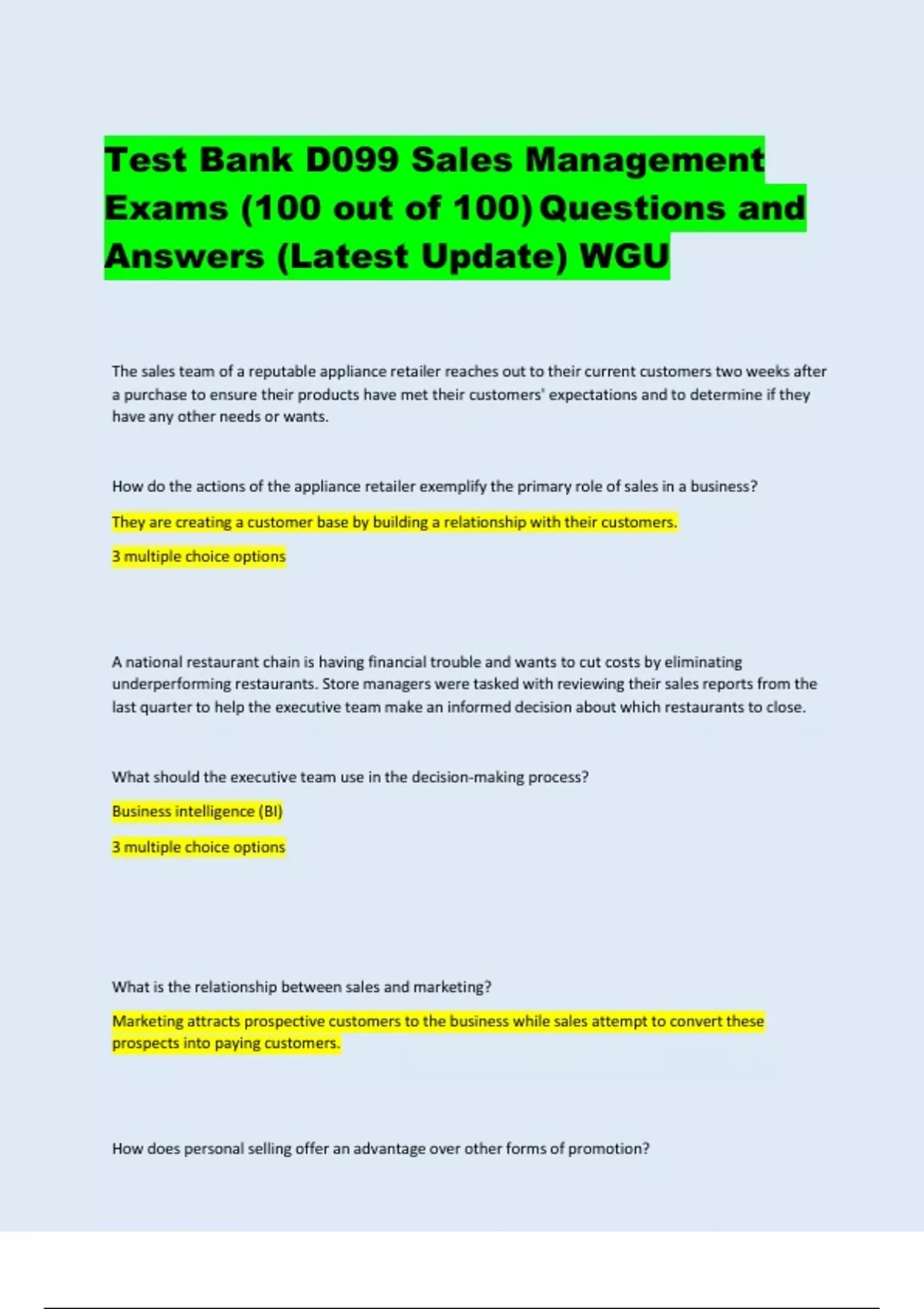 Test Bank D099 Sales Management Exams (100 out of 100) Questions and Answers (Latest Update) WGU