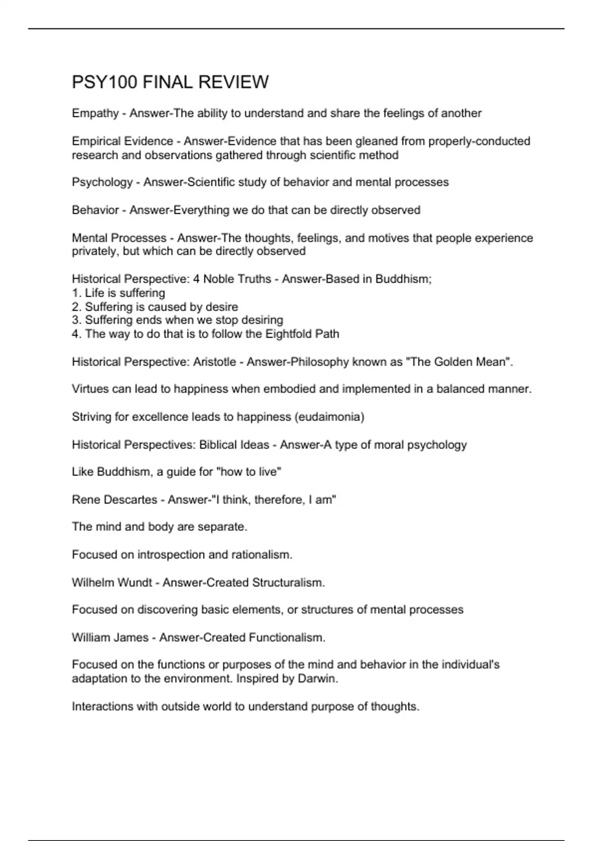 Empathy - Answer-The ability to understand and share the feelings of another Empirical Evidence - Answer-Evidence that has been gleaned from properly-conducted research and observations gathered through scientific method Psychology - Answer-Scientific study of behavior and mental processes Behavior - Answer-Everything we do that can be directly observed Mental Processes - Answer-The thoughts, feelings, and motives that people experience privately, but which can be directly observed Historical Perspective: 4 Noble Truths - Answer-Based in Buddhism; 1. Life is suffering 2. Suffering is caused by desire 3. Suffering ends when we stop desiring 4. The way to do that is to follow the Eightfold Path Historical Perspective: Aristotle - Answer-Philosophy known as "The Golden Mean". Virtues can lead to happiness when embodied and implemented in a balanced manner. Striving for excellence leads to happiness (eudaimonia) Historical Perspectives: Biblical Ideas - Answer-A type of moral psychology Like Buddhism, a guide for "how to live" Rene Descartes - Answer-"I think, therefore, I am" The mind and body are separate. Focused on introspection and rationalism. Wilhelm Wundt - Answer-Created Structuralism. Foc